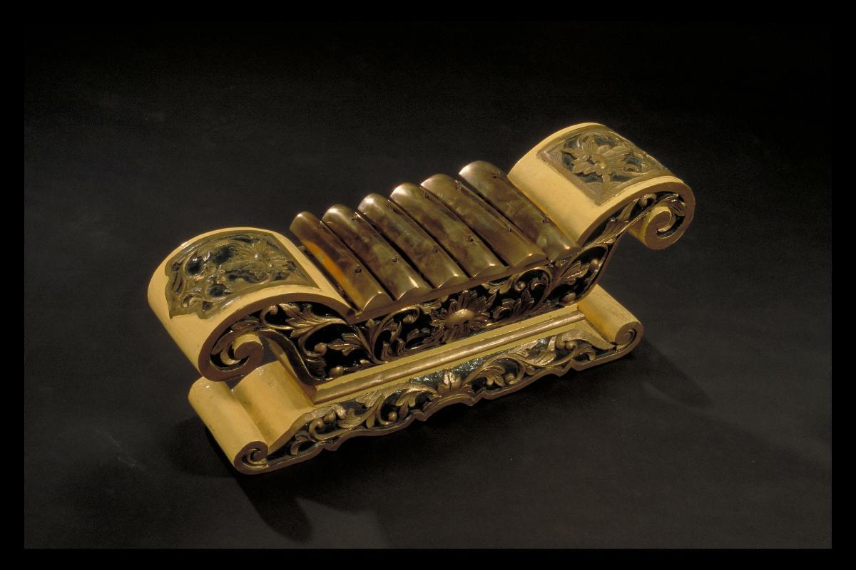 This instrument with flat bronze keys is called a gender barung. It is one of the softer instruments that are part of the gamelan ensemble. The term 'gamelan' refers to the action ('an') of hammering ('gamel') bronze instruments such as gongs and drums among several other types of intruments with beaters.The bronze instruments play the main melody and are accompanied by softer wind, wood and string instruments. The practice of taking off shoes and not stepping over the instruments is a sign of respect and it is believed that the correct manner of playing results in refinement of one's character. Today, gamelan music remains an important part of court and village life in Java. Many sets are kept as royal heirlooms (pusaka) and are played at important ceremonies.
