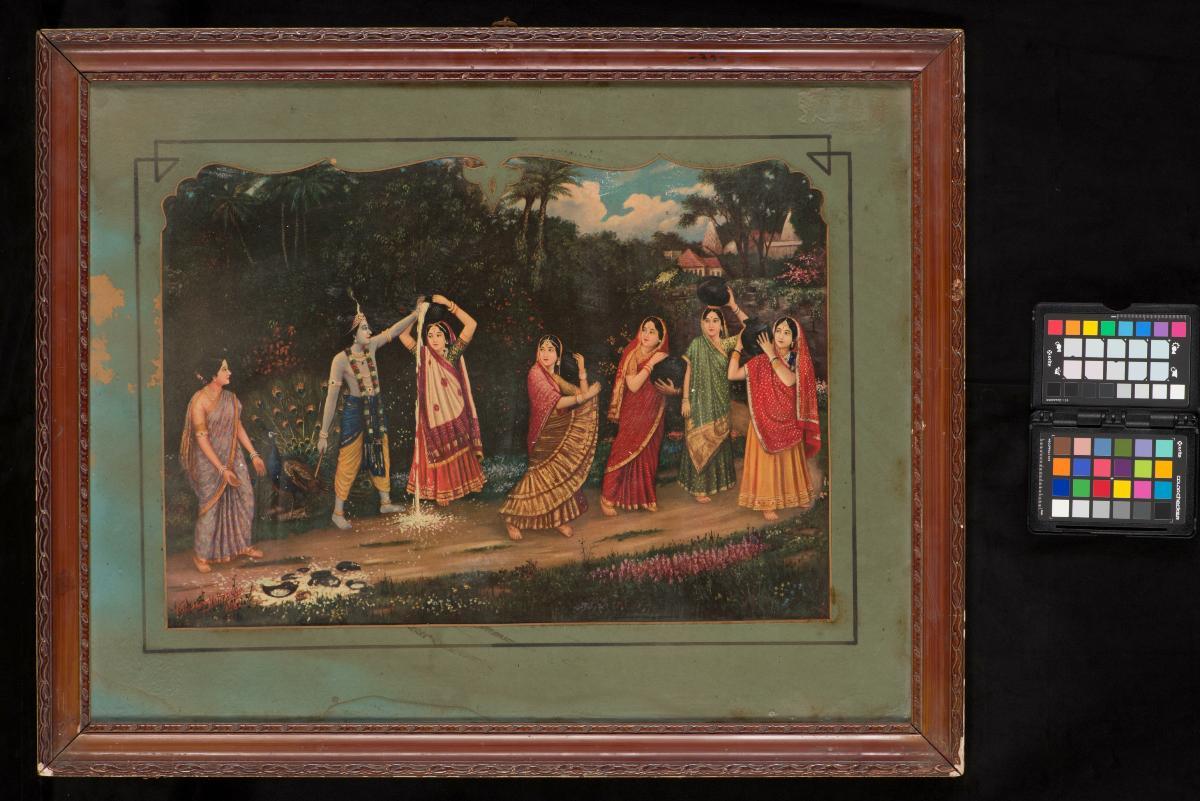 This painting depicts Jala Vihara of Krishna as Gokulnathji or Madanmohanji (two-armed image playing the flute). Here, Krishna is accompanied by Radha and a gopi (milkmaids). They seem to stand in the middle of a lake full of white and pink lotuses. In the foreground of the painting, the bank of river Yamuna is depicted lined with a row of lotuses growing by the edge. This whole painting has a blue background that tends to depict the painting in an underwater scene or a nocturnal one. Krishna is the eighth and most popular incarnation or avatar of Vishnu, and Radha, his consort.