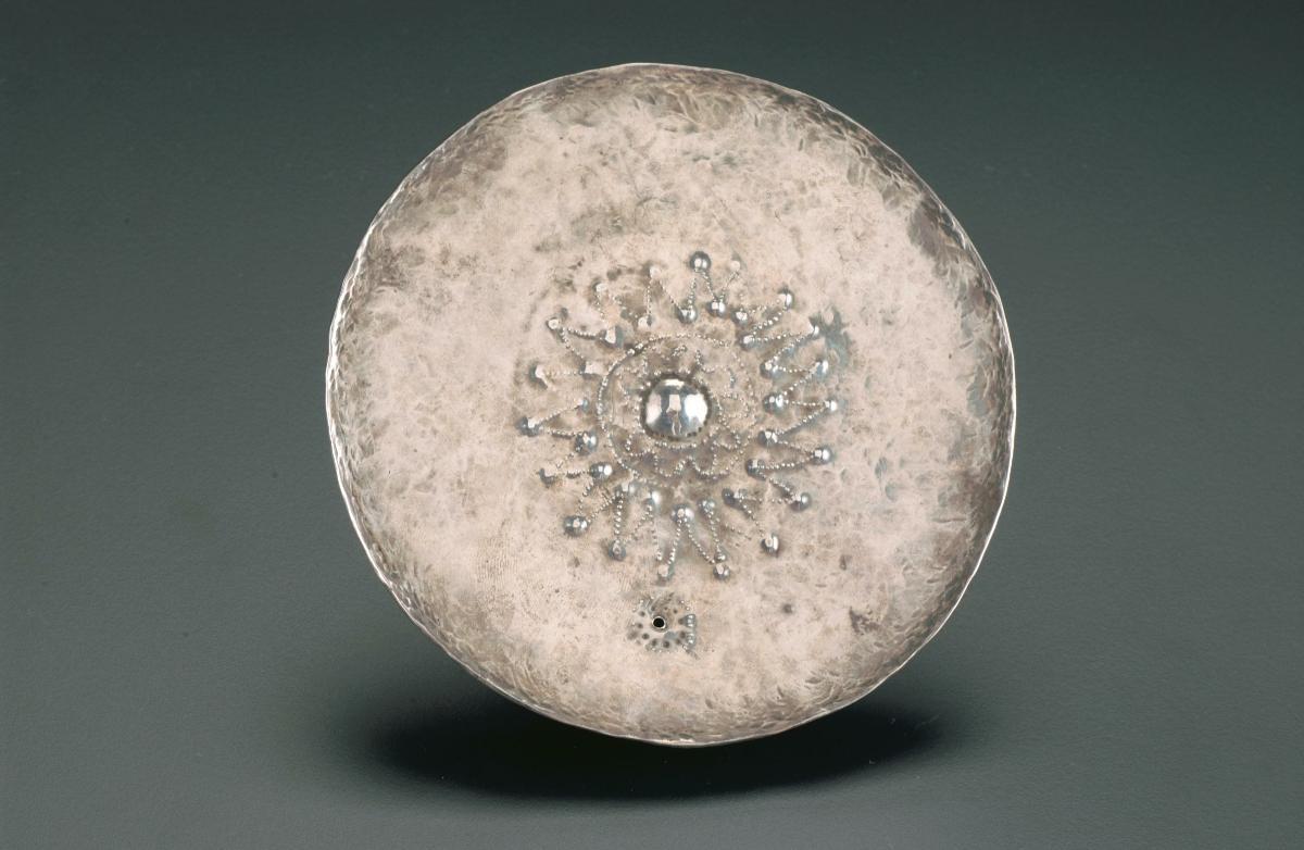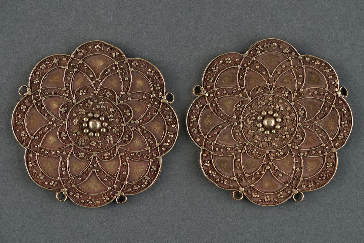 This is a set of silver frontal discs with various crescent moon, star or sun designs in repoussé. These discs could be once a headhunting emblem presented to returning warriors by the local aristocrats. Men wore headtaking discs as badges of prestige and bravery. In Timor, heads replenished village fertility and prosperity and headhunting was a basic feature of Timor political life in pre-modern times. However, women may wear the pectoral discs at the ritual after they have given birth, for childbirth is likened to warfare. Such ornamental discs were typical of ornaments of the eastern islands of Indonesia.