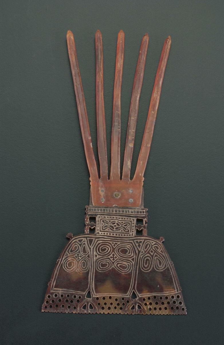 This comb comes from the Dayak people in Borneo. The central metalpiece is decorated with foliage motifs and carries ornaments that would tremble with the wearer's movements. Metal jewellery was part of the Dayak ritual costumes made of elaborately woven textiles. It has been suggested that metalworking among the Dayak is linked to masculinity, whereas textiles, other than those with beadwork and barkcloth, are associated with feminity.