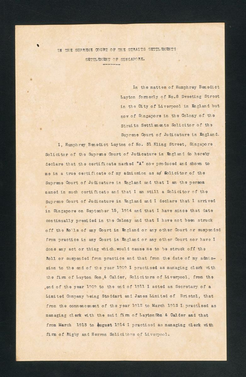 This is a set of documents concerning the admission of Humphrey Benedict Layton to the Supreme Court of the Straits Settlements as a solicitor and advocate. It is part of a collection of legal documents from the 19th and early 20th centuries which provides a glimpse into the work of the notable personalities who left their mark on Singapore’s legal history, and the economic and other transactions undertaken by ordinary immigrants in 19th century Singapore that tell stories of misfortune and indebtedness which would otherwise have disappeared from history.