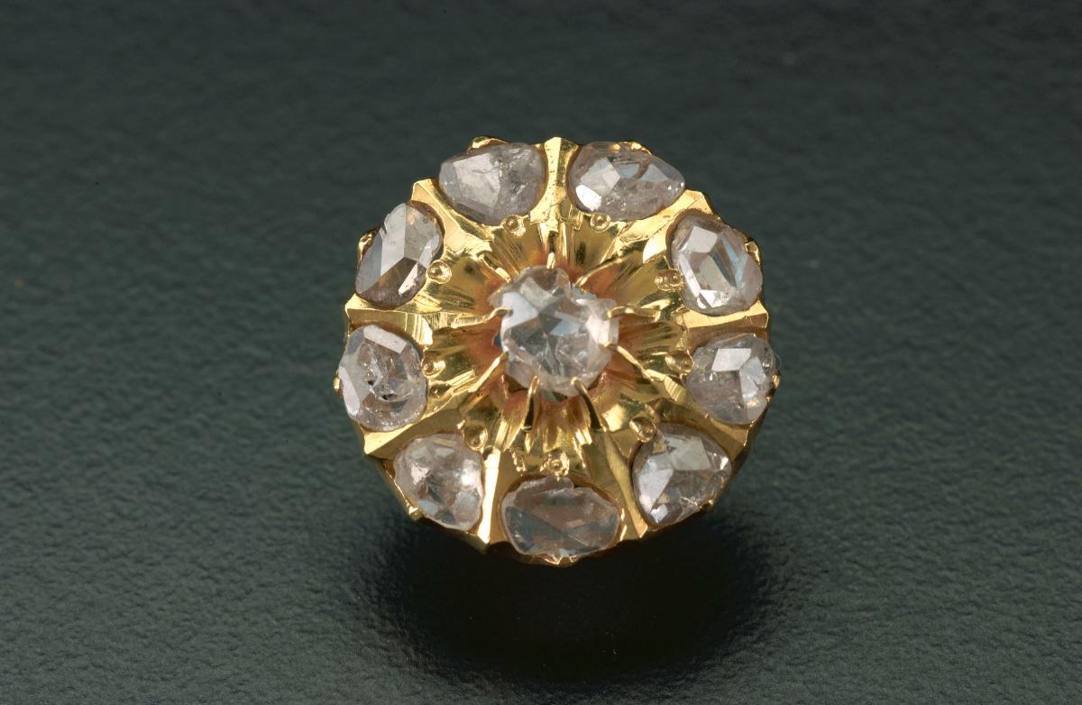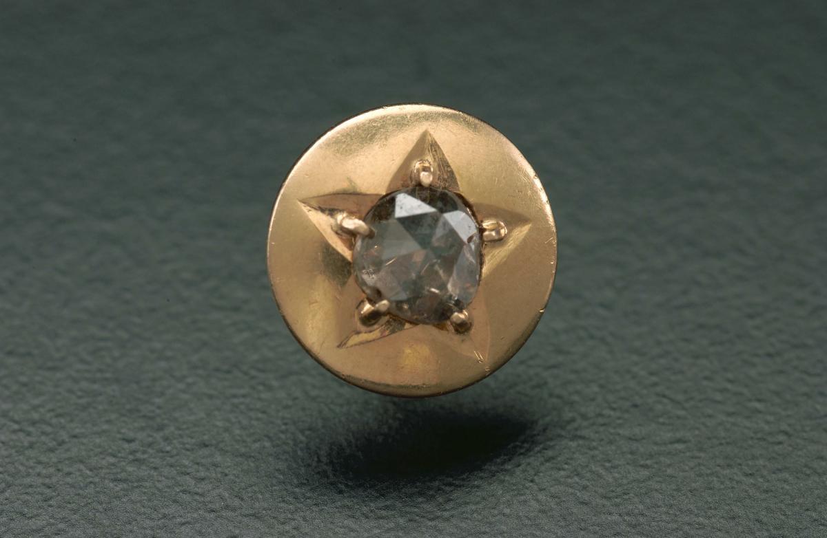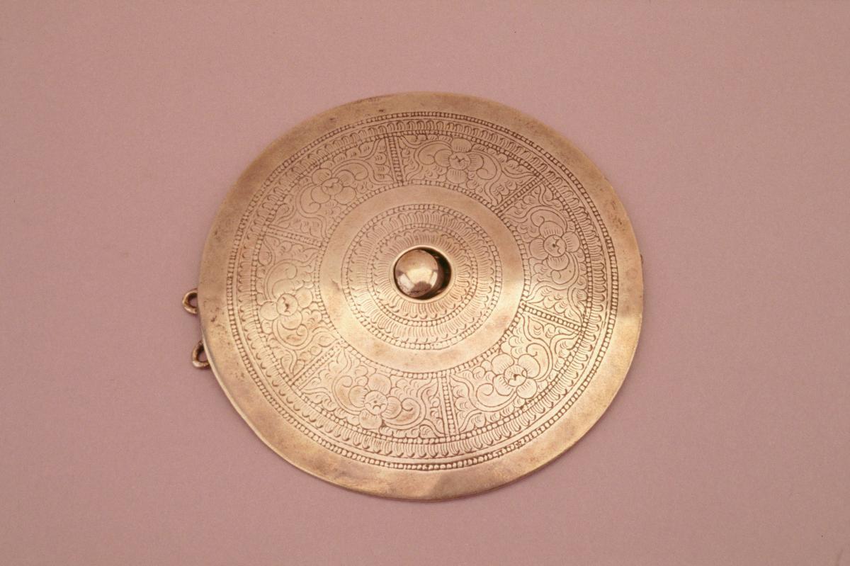 This ornamented gold button, studded with diamonds to form a floral design, was worn by Peranakan women and belonged to a set. Their buttons were usually decorated with filigree gold, gilt silver and diamonds. In contrast, buttons worn by Peranakan men tended to be plain in design, and were usually made of silver, bakelite, ivory, amber and bone. American and European coins were also adopted to become buttons for men.