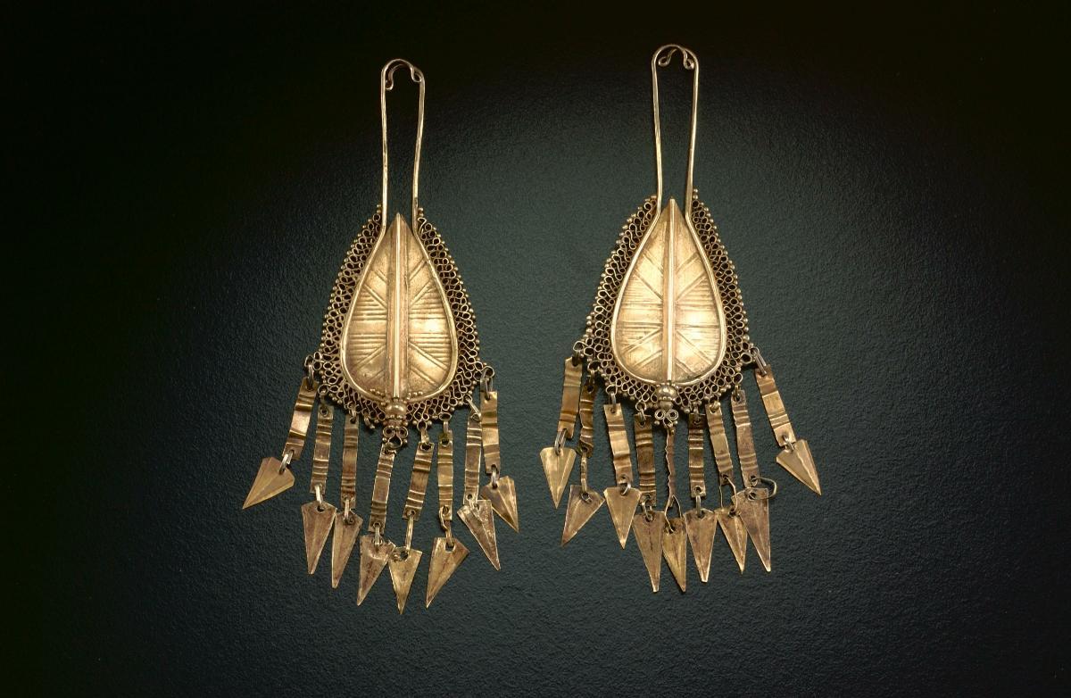 This is a pair of earrings worn by the Batak women, which reflects an indianised style of Batak jewellery. In their religion, the Batak have preserved many features clearly derived from Hindu-Buddhist influence, and these influences were mostly likely brought about through trade with India as early as the 4th century. Jewellery has many different functions in island Southeast Asia, for example it was used to indicate social positions, to symbolise the importance of the social relationship between the giver and the receiver during gift exchanges, and to serve as miniature religious objects.