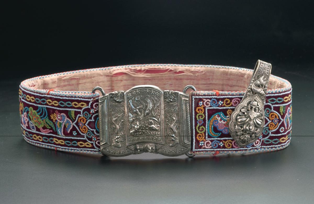This 'tali pinggang' (belt) features a 'pending' (belt buckle) and a strap made up of panels elaborately decorated with foliage designs. It was probably worn on ceremonial occasions, as those for daily use were simple and relatively unadorned. It has been suggested that such belts with panels belonged to a later period, whereas earlier ceremonial belts were made with many interlocking links and rings.