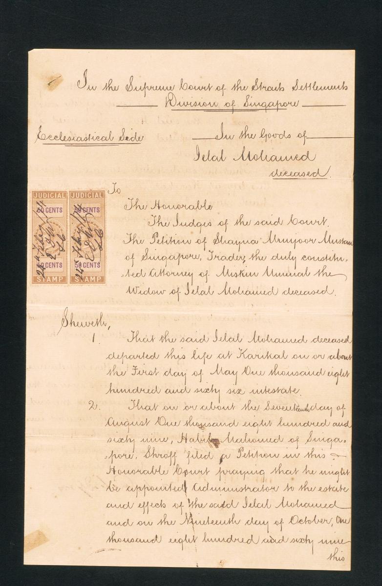 These are the warrant to act and the petition issued by Shayna Mumjoor Mustan, the duly constituted attorney of Mistim Umunah, the widow of the deceased Jelal Mohamed. These documents concern the administration of the deceased's estate. They are part of a collection of legal documents from the 19th and early 20th centuries which provides a glimpse into the work of the notable personalities who left their mark on Singapore’s legal history, and the economic and other transactions undertaken by ordinary immigrants in 19th century Singapore that tell stories of misfortune and indebtedness which would otherwise have disappeared from history.