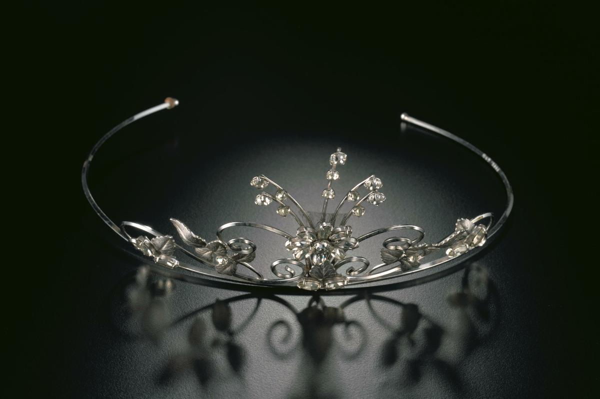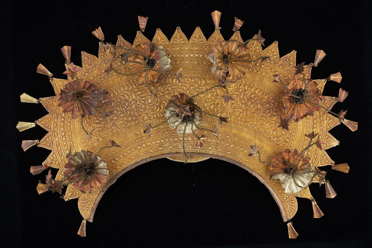 This distinctively Palembang-style bridal crown, with glided copper ornaments, features two dragons and three cranes, of which ‘Shou Lao’ (the god of longevity) rides on the central crane with a pair of attendants at his sides. This bridal crown was worn by Indonesian Peranakan brides.