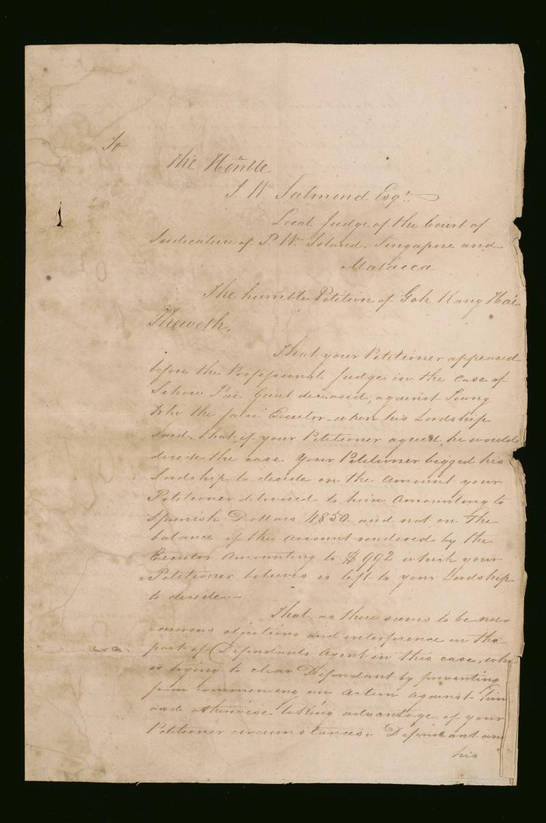 These are the petition and the warrant to act concerning the estate of the deceased Goh Tooah Tee. The warrant to act was issued on 14 September 1865 by the petitioner, Goh Soon Ann. These documents are part of a collection of legal documents from the 19th and early 20th centuries which provides a glimpse into the work of the notable personalities who left their mark on Singapore’s legal history, and the economic and other transactions undertaken by ordinary immigrants in 19th century Singapore that tell stories of misfortune and indebtedness which would otherwise have disappeared from history.