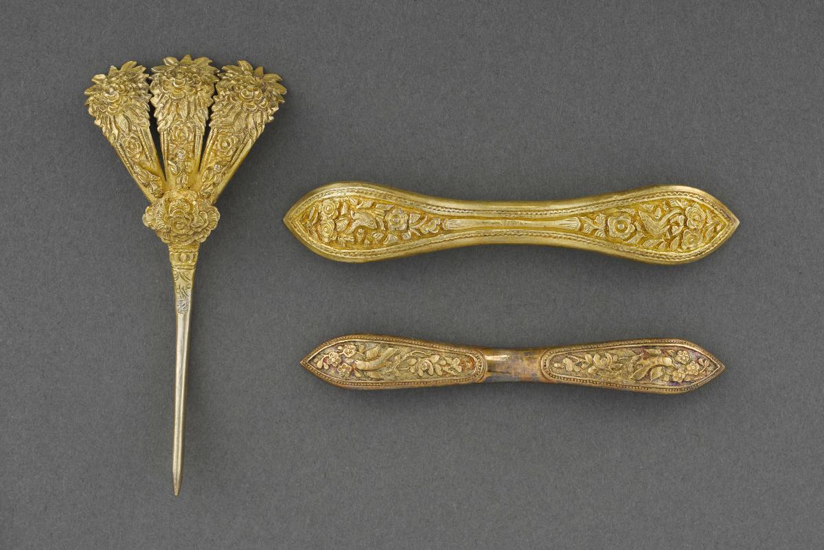 These hairpins are known as 'korek kuping', which literally means ‘ear picks’. They were part of a set of three, which includes one hairpin with a decorative top. A Peranakan woman, also known as Nonya, would traditionally tie her waist-long hair into a coiled bun, which would be held in place with hairpins. The common practice in Malacca and Singapore was to use three pins whereas in Penang, up to seven hairpins were used. As the bun was worn high near the top of the head and was wound very tightly, older Nonyas face gradual hair loss, receding hairlines, and bald spots. By the 1930s, hairpins were no longer relevant to the younger Nonyas who cut their hair according to the latest Western fashions.