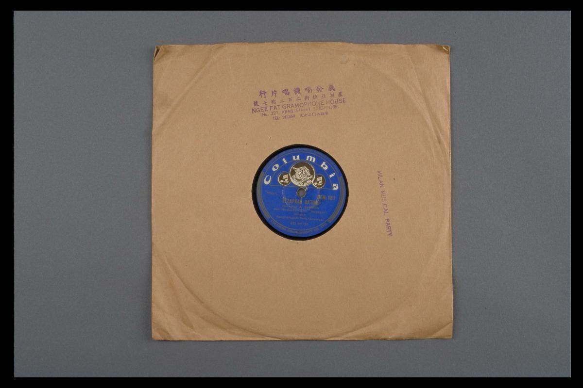 This is a photograph of a Malay pop song vinyl record (or gramophone record) made in the 1950s to 1960s. Until the 1960s, the majority of these records were produced in India. Before World War Two, Malay songs were ‘Bangsawan’, ‘Dikir Barat’, ‘Keroncong’, ‘Ghazal’ or copies of Indonesian songs. In the late 1940s, however, Malay singers started to infuse different styles into their music. Ranging from Indian film music to Western popular music, these styles were modified and adapted in the Malay context to create a new sound, thus allowing Malay music to develop a new identity and its own cultural substance. In addition, folk songs (and some traditional songs) were increasingly modernised and popularised during this period to go along with this new identity. These Malay singers and their songs became very popular especially in the urban areas. Singapore was the centre of the bourgeoning Malay entertainment industry, which included music and films, from the 1940s to the 1960s.