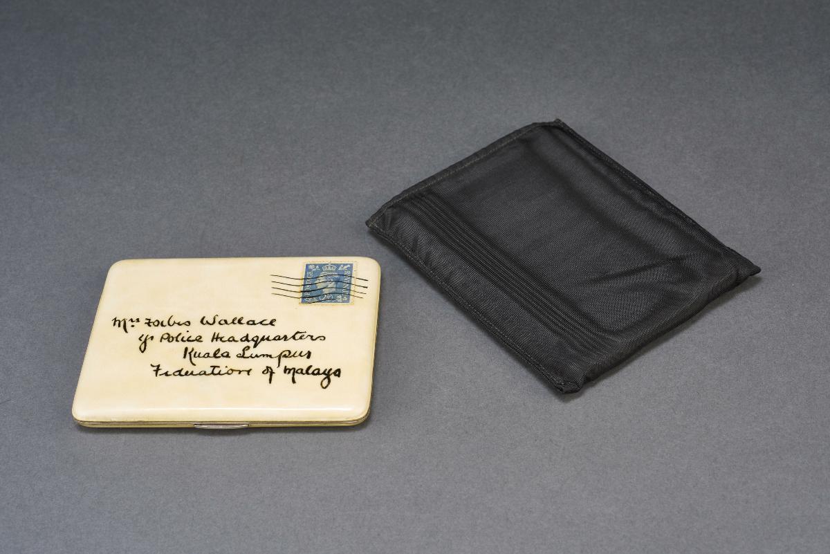 The silver case belonged to a POW, Sergeant William Neil. It is engraved with the letters of the Third Battalion of the Straits Settlements Volunteer Force (SSVF) and the emblem of the Penang & Province Wellesley Volunteer Corps. The SSVF comprised civilian volunteers who undertook some form of military training and participated in the defence of Malaya and Singapore during the Japanese invasion.
