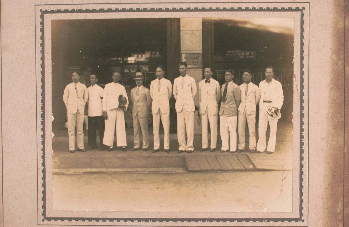 A group of Chinese men posing at a pavilion the Botanic Gardens
