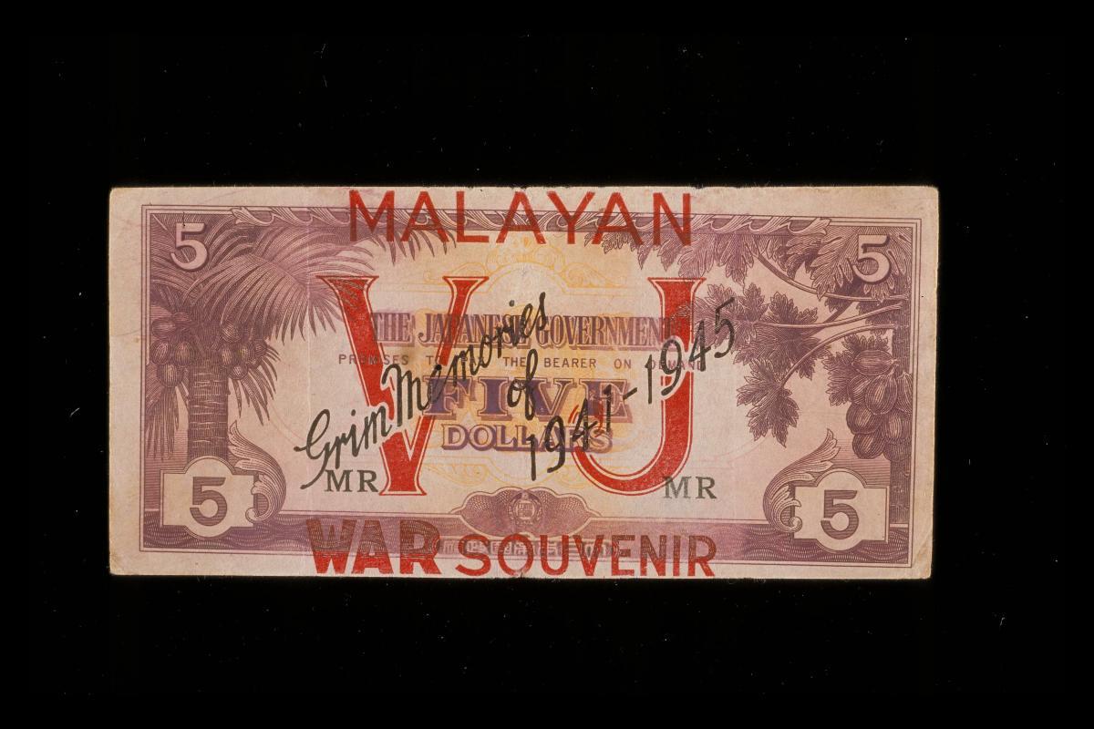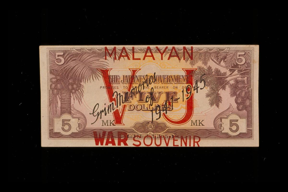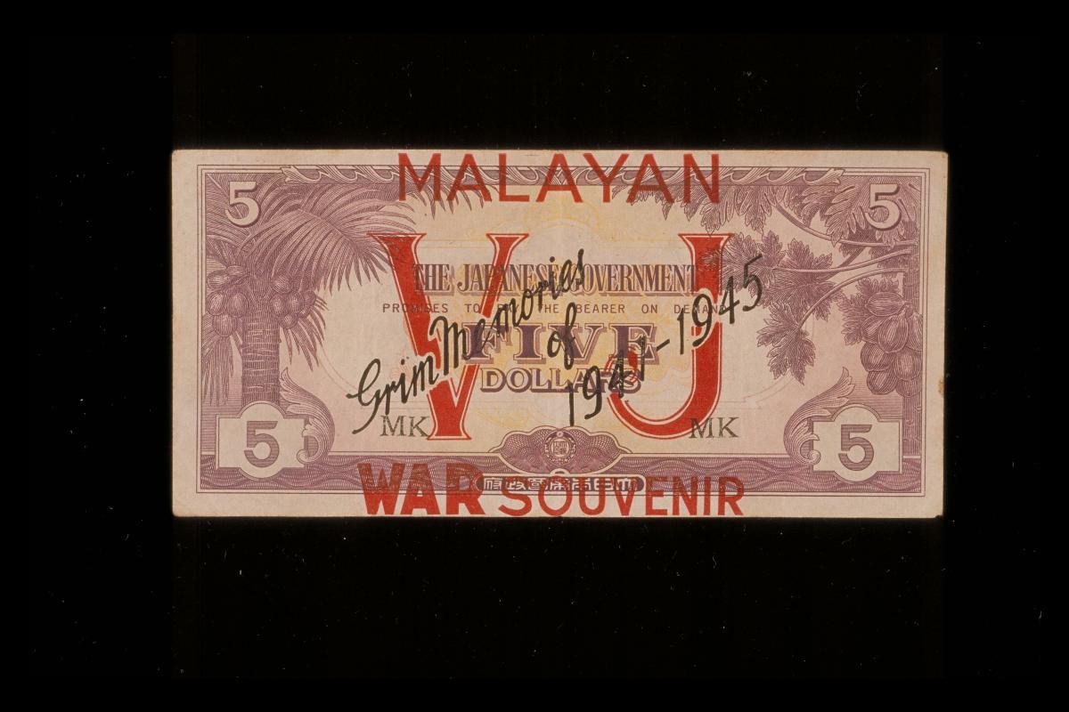 This is a ten dollar Malayan Japanese invasion money (JIM) note overprinted with phrases such as: ‘Malayan VJ’ (Victory over Japan), ‘war souvenir’ and ‘grim memories 1941-1945’. It was printed by unknown parties to publicise the Allied victory over Japan and the demise of the JIM.