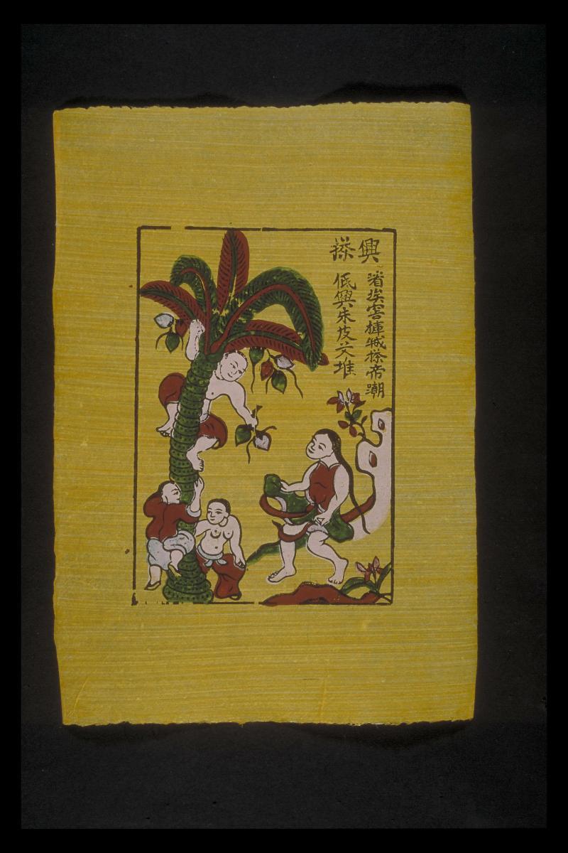 Woodblock printing is thought to have been introduced from China as early as the Ly dynasty (1010-1225). This colourful image, made from recycled paper, belongs to a set of 12, was produced using a combination of woodblock printing for the outlines, and filled in with Chinese inks.The Hang Trong style is known after the street named Hang Trong, where resident printmakers were part of a lively industry up until the 1940’s. These prints were made by Mr. Le Ding Nghien, who has continued his family’s tradition of printmaking in this style. Vietnamese woodblock prints include a wide repertoire of images and stories, including depictions of auspicious festive activities, protective door guardians, episodes from popular legends and many more. They also include legendary folk heroes who fought the Chinese and later became deified, Buddhist and Taoist deities, popular stories associated with feritlity, relationships and satirical forms of social commentary.The image illustrates the vitality of country youth.
