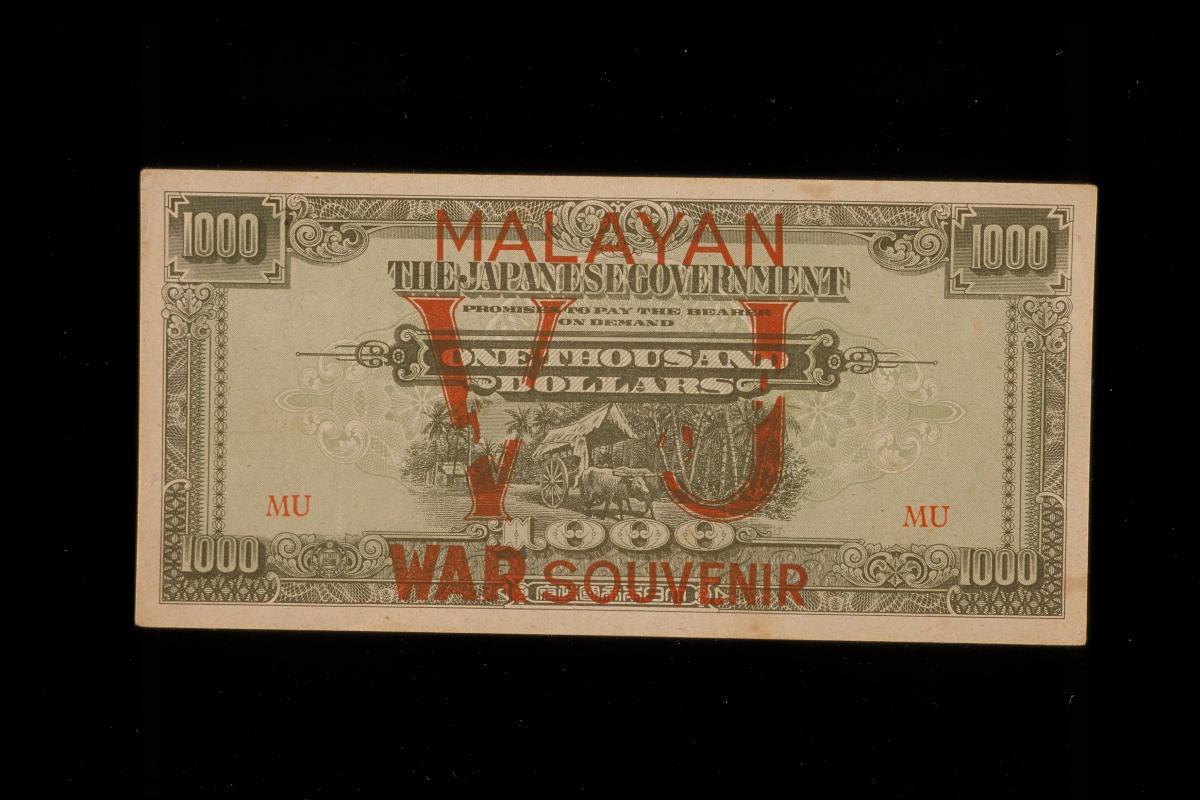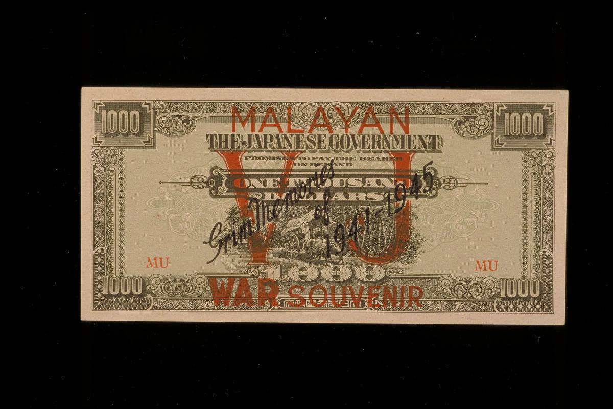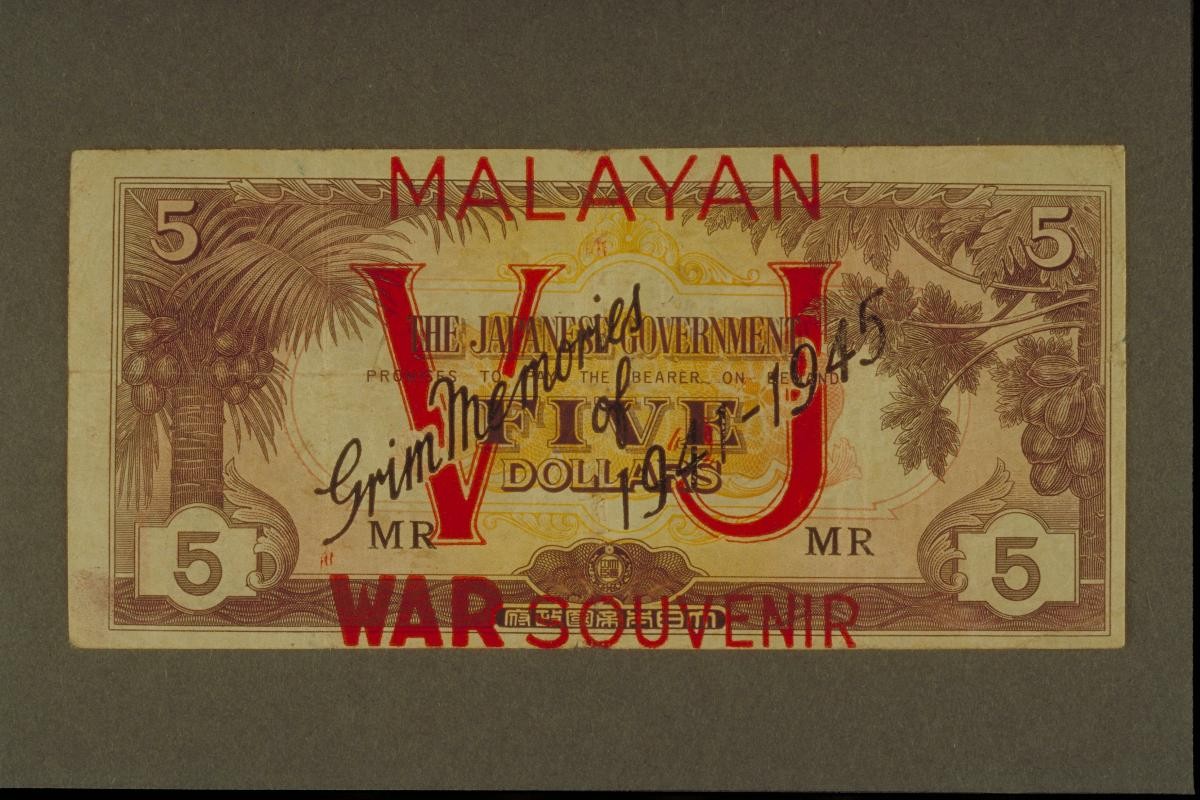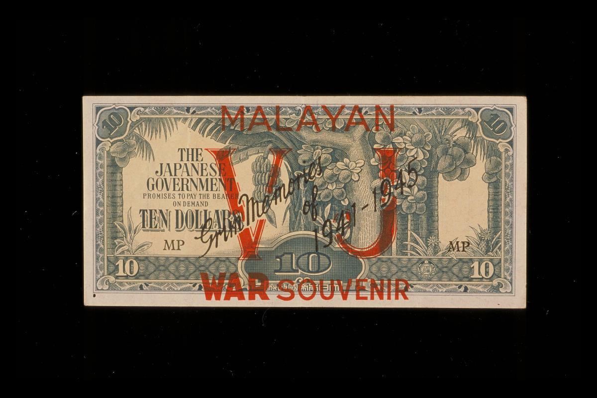 This is a one hundred dollar Malayan Japanese invasion money (JIM) note overprinted with phrases such as: ‘Malayan VJ’ (Victory over Japan), ‘war souvenir’ and ‘grim memories 1941-1945’. It was printed by unknown parties to publicise the Allied victory over Japan and the demise of the JIM.