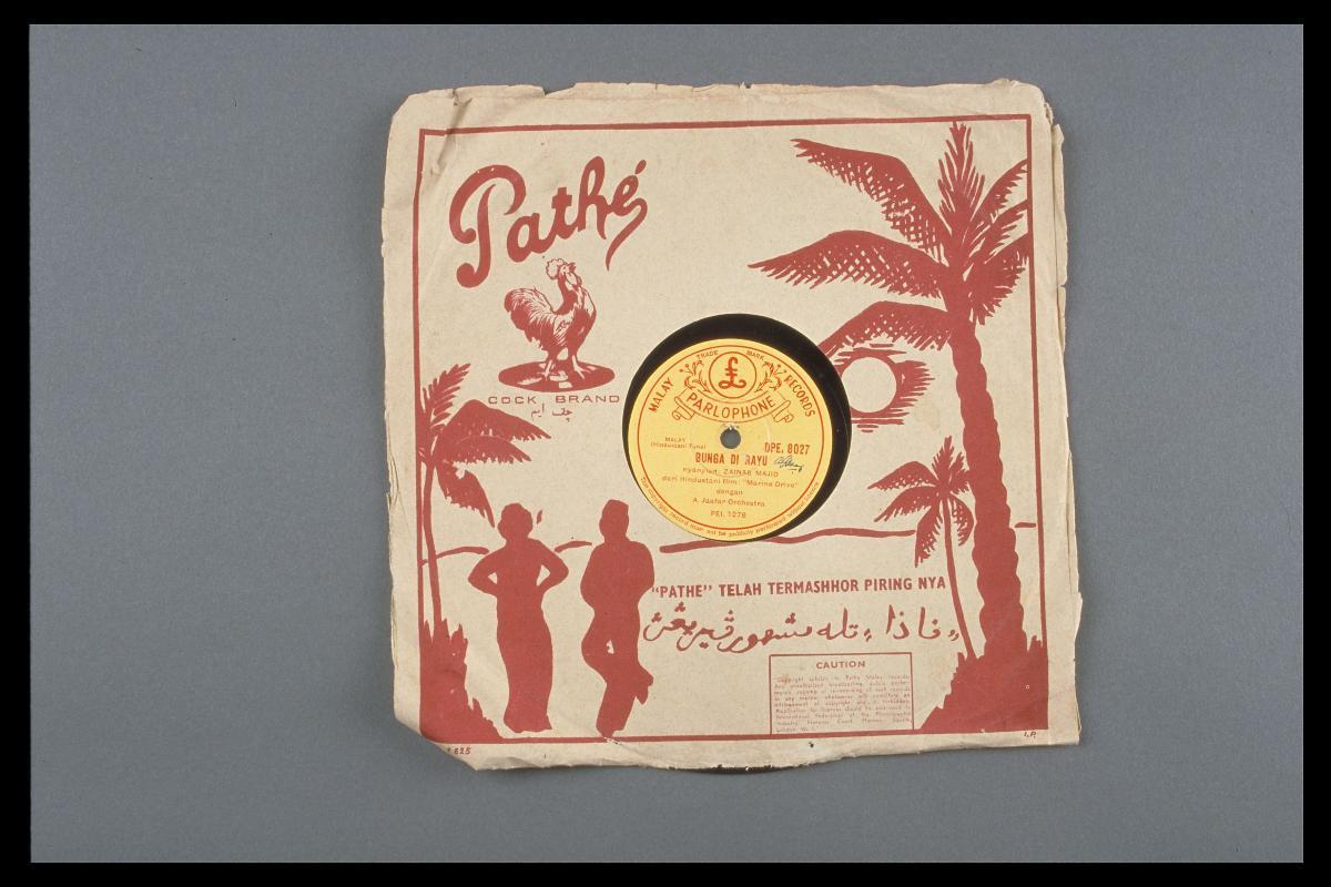 This is a photograph of a Malay pop song vinyl record (or gramophone record) made in the 1950s to 1960s. Until the 1960s, the majority of these records were produced in India. Before World War Two, Malay songs were 'Bangsawan', 'Dikir Barat', 'Keroncong', 'Ghazal' or copies of Indonesian songs. In the late 1940s, however, Malay singers started to infuse different styles into their music. Ranging from Indian film music to Western popular music, these styles were modified and adapted in the Malay context to create a new sound, thus allowing Malay music to develop a new identity and its own cultural substance. In addition, folk songs (and some traditional songs) were increasingly modernised and popularised during this period to go along with this new identity. These Malay singers and their songs became very popular, especially in the urban areas. Singapore was the centre of the bourgeoning Malay entertainment industry, which included music and films, from the 1940s to the 1960s.