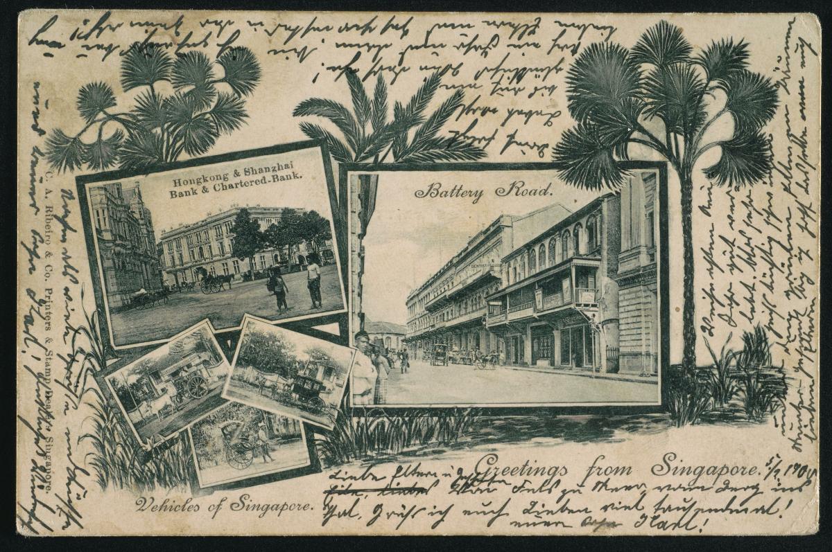 A leading department store during the early 20th century, Whiteaway Laidlaw took over this space at Battery Road in 1910 after Flint's Building was destroyed by fire on the same site. Next to it was a building that hosted a number of tenants during the 20th century, including the Chartered Bank, the Bank of Taiwan and the Bank of China.