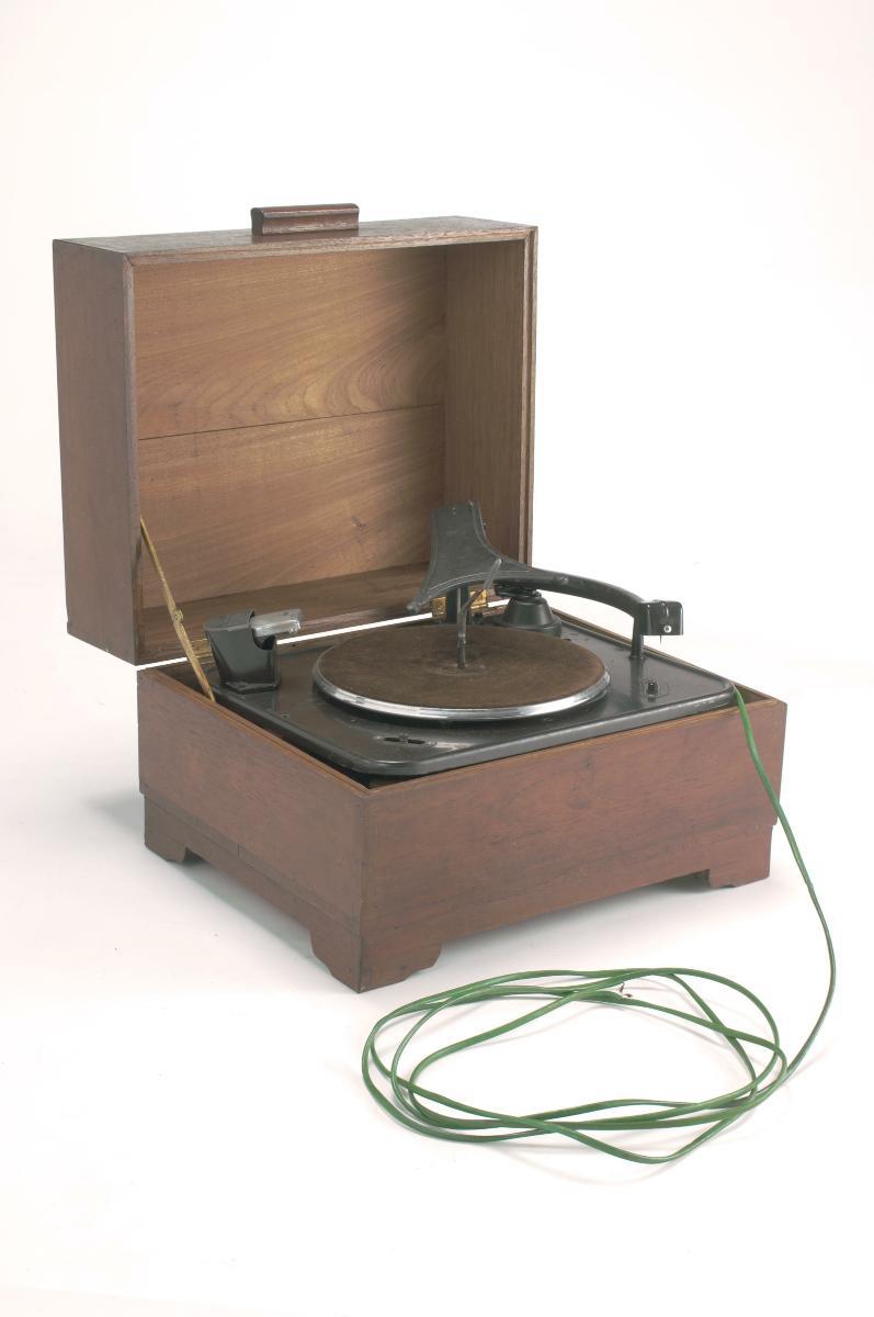 This gramophone is made by His Master’s Voice or HMV from London. The company was previously known as Gramophone and Typewriter Limited.