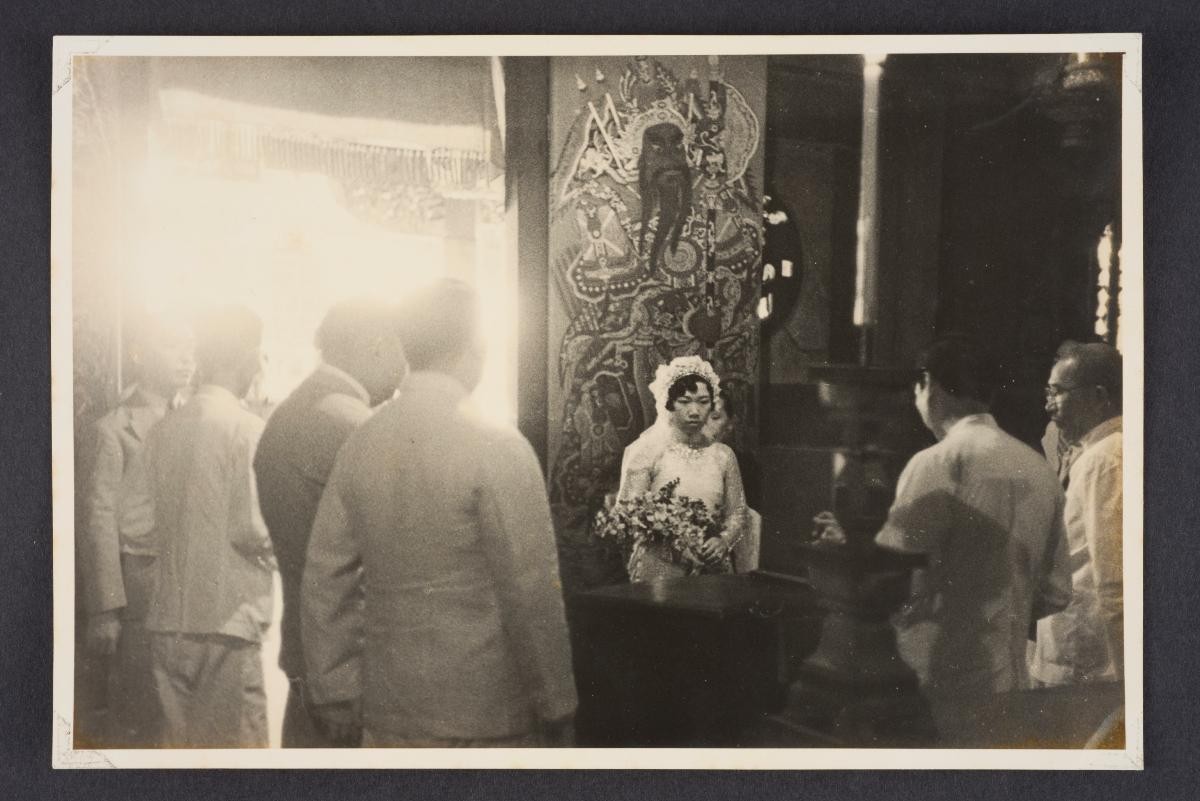 The adoption of Western wedding customs and attire in Singapore accelerated in the early 20th century. They were first adopted by the Eurasians and Straits Chinese, followed by the Chinese and Indians. The initial change was largely attributed to the conversion to Christianity. Other possible factors for its adoption and continued popularity of this trend include the desire to be modern, an affordable alternative to the costly traditional wedding attire, and influence from Western education and the mass media. This bride is wearing a lace cape with a Peter Pan collar on her wedding dress and a long train. Although the lace dress is elaborate, the veil is simple and elegant.