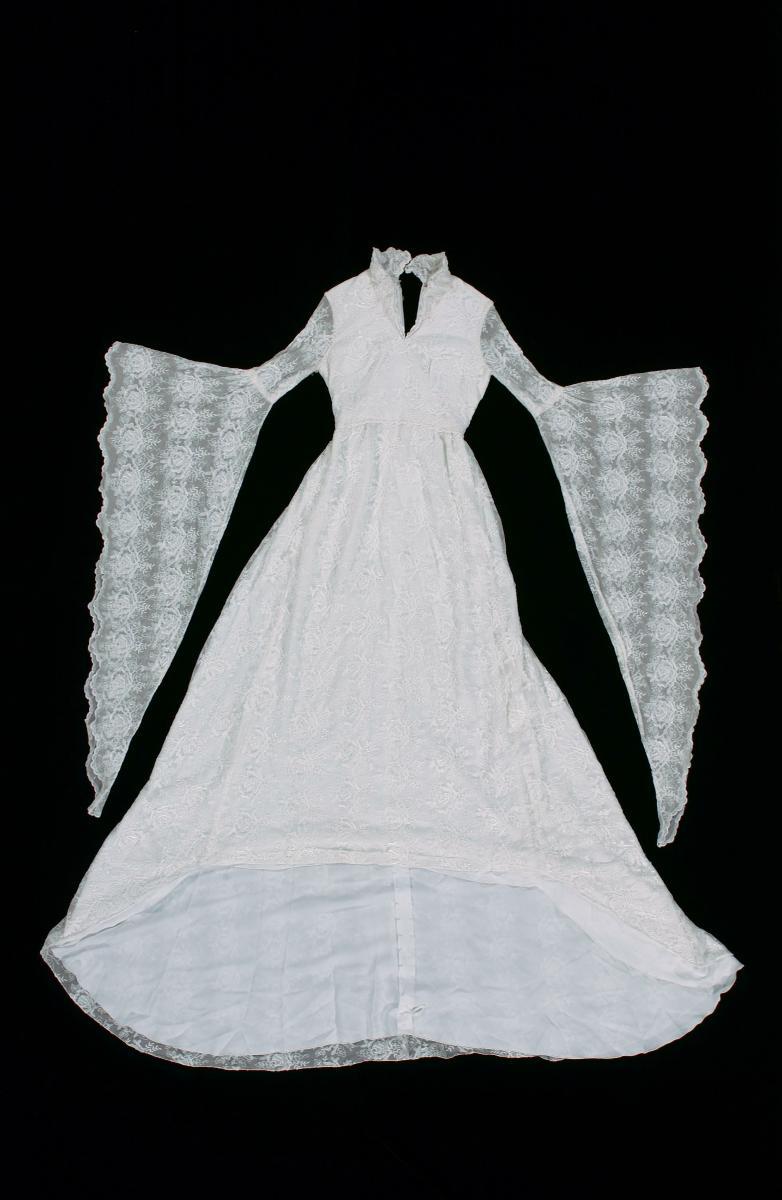 Made by one of Singapore's earliest wedding gown designers Sylvia Kho, this wedding gown is a fine example of her embriodery and tailoring skills. The boat neck dress with a long train is embriodered all over with sequins, pearls and roses made of Swiss lace. These appliqued flowers give the dress a three-dimensional look. The three-quarter sleeves are ruched at the end and decorated with sequins and beads.