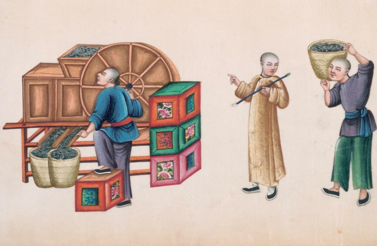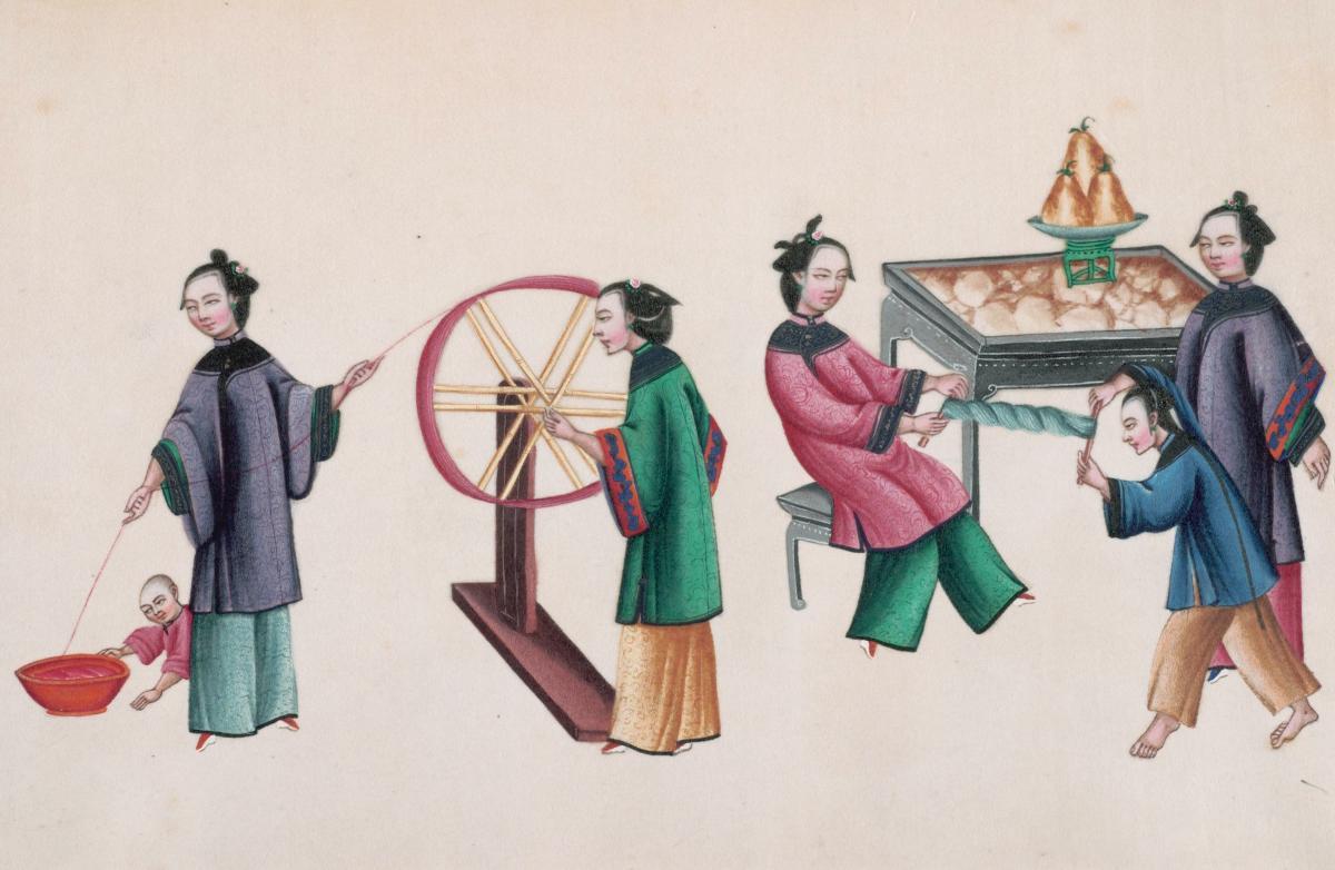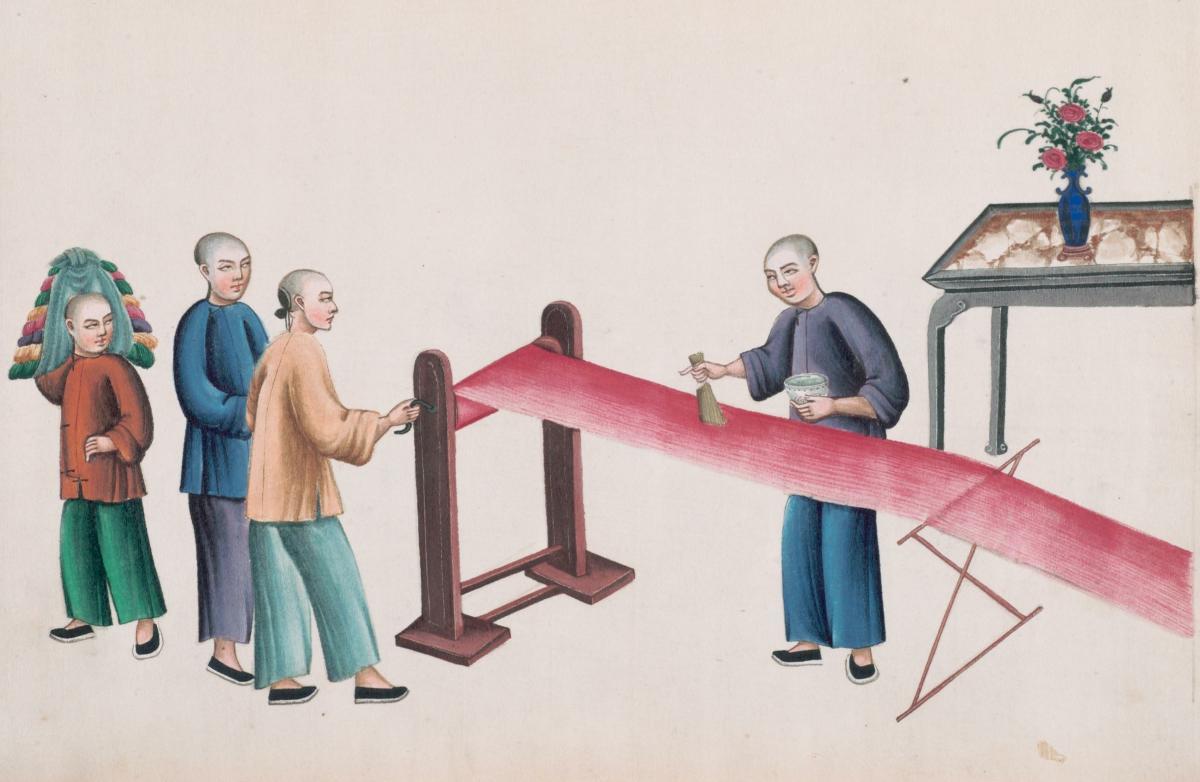This watercolour painting shows four men dyeing silk skeins of yarns of different colours. The skeins are dried on bamboo poles secured at either end on forked tree branches in barrel-like containers.