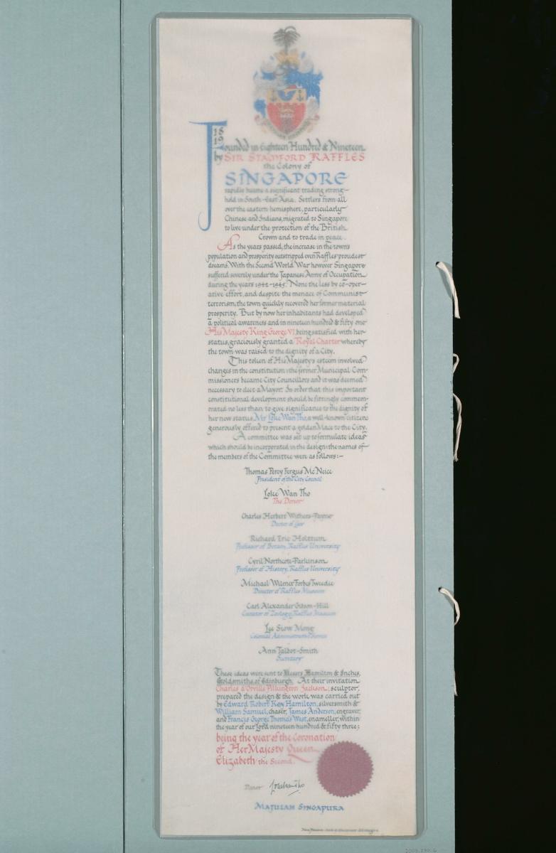 Prominent Chinese philanthropist Loke Wan Tho presented this golden Mace to the City of Singapore in conjunction with the granting of a Royal Charter by King George VI in 1951, which raised the status of Singapore to a City. The Mace was made by Messrs Hamilton & Inches, Goldsmiths of Edinburgh. The design motifs were suggested by a committee consisting of Loke, university professors, and the staff of Raffles Museum, which later became the National Museum of Singapore.