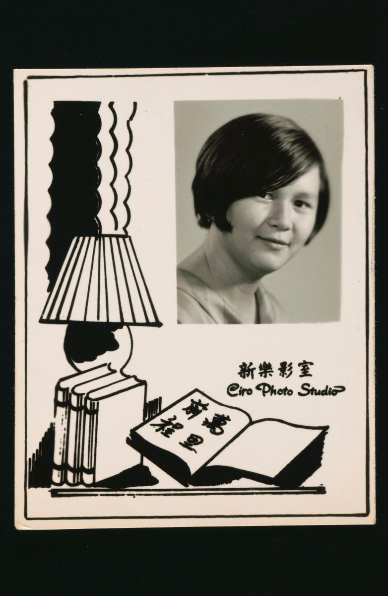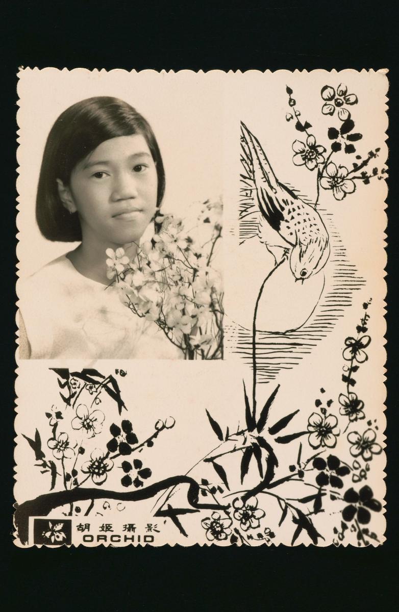 Post-WWII photographic studios in Singapore produced greeting cards like the one seen here—the sender’s photograph is printed with illustrations and greetings, a style reminiscent of the photographic ‘cartes-de-visite’, which were immensely popular during the late 19th century. Often, the choice of the accompanying design reflected the personality of the sender, who penned personal greetings to a friend or relative on the back of the card.