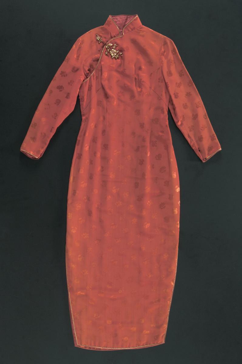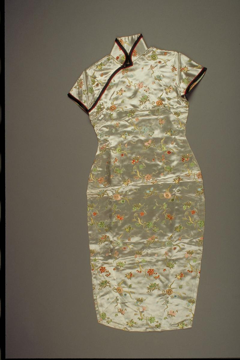 This red, sleeveless, ankle-length cheongsam is decorated with flowers using the batik technique of Malaysia. Made of silk, the collar, sleeves, flap on the right bodice, and hems are lined with white piping. This belonged to Mrs. Goh, the late mother of the donor, Mr. Goh Eck Kheng. She was a teacher at Methodist Girls’ School, which was then located at Mount Sophia in Singapore. Ankle-length cheongsams similar to this piece were worn by Chinese women on formal occasions in Singapore