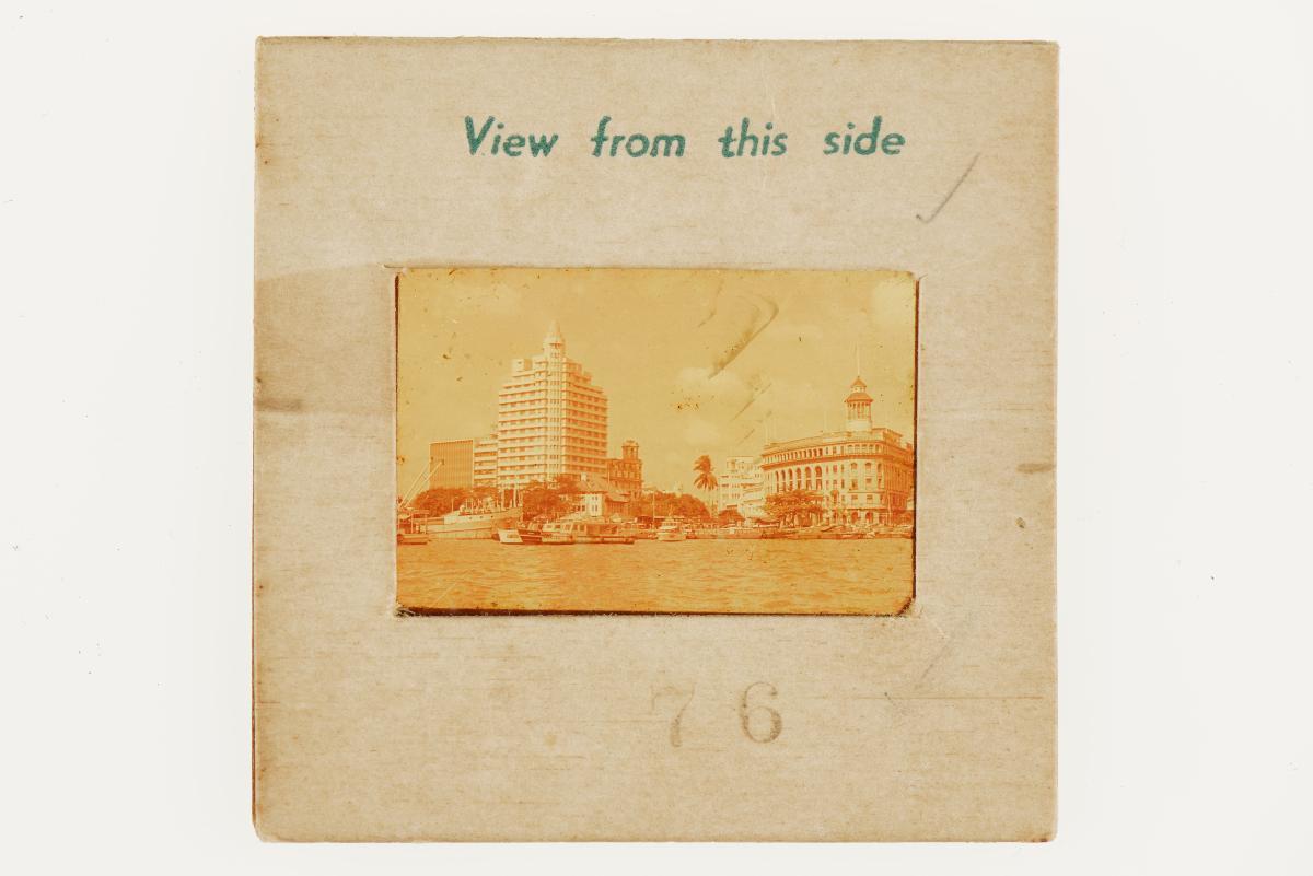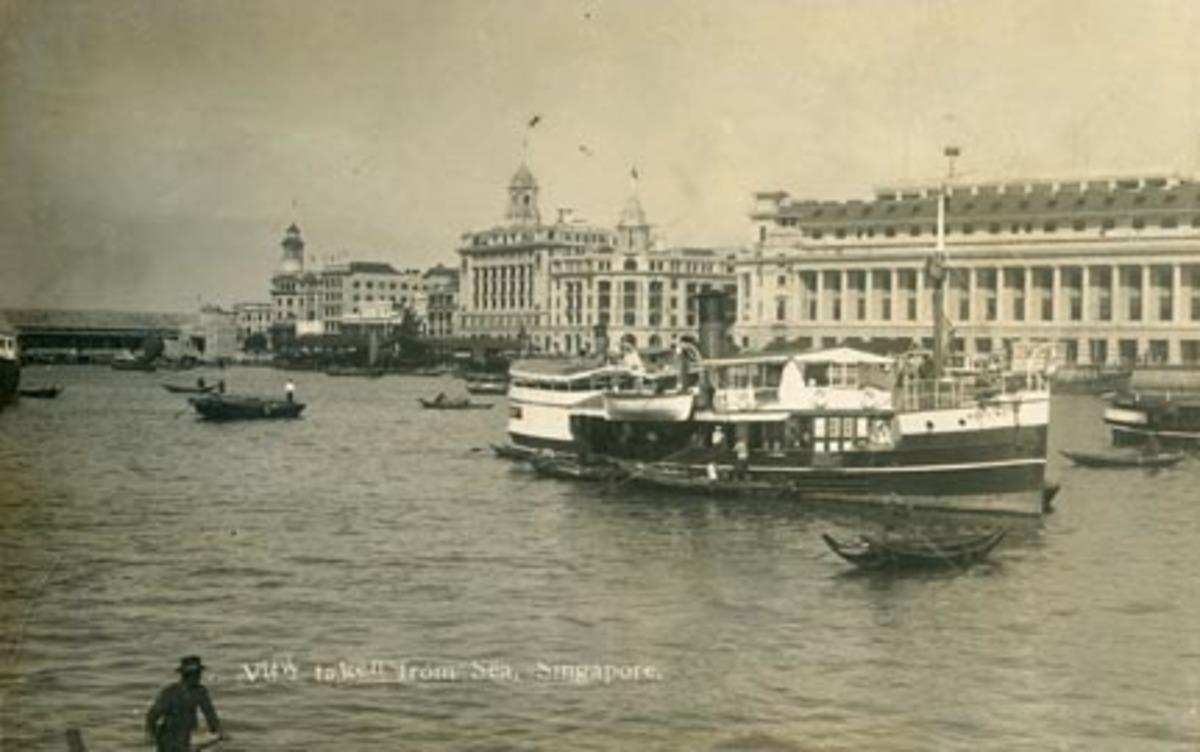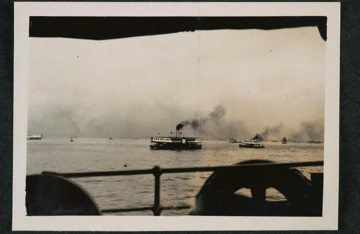 Several three-masted Chinese junks can be seen in this oil painting. The hull of a Chinese junk is characteristically painted at the top and the sterns painted with two circles to look like eyes.
