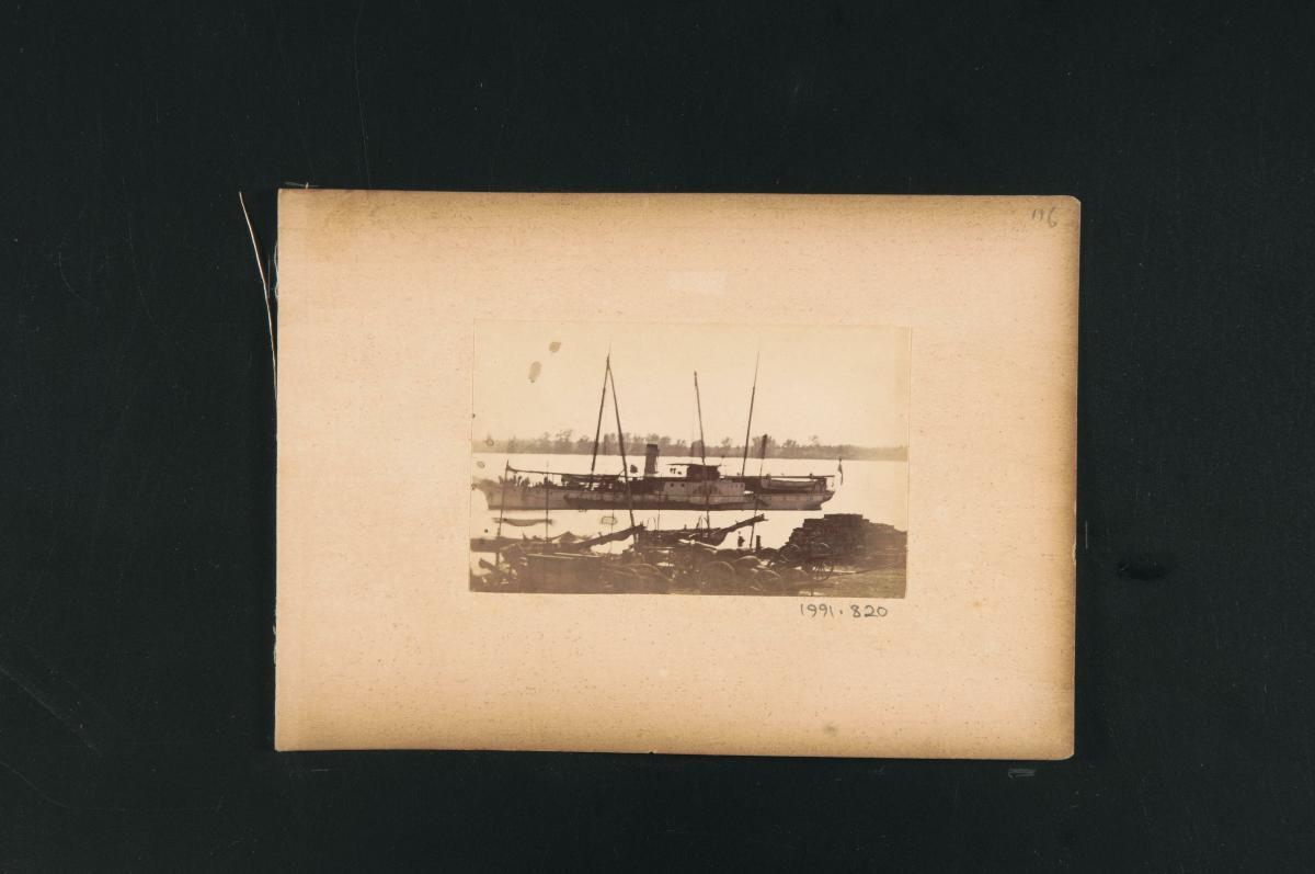 This painting was rendered in the style of Chinese Export paintings. It shows the Singapore Institution (Raffles Institution) behind the ship bearing a French flag and St. Andrew's Church (St. Andrew's Cathedral from 1870) with its steeple on the seafront.