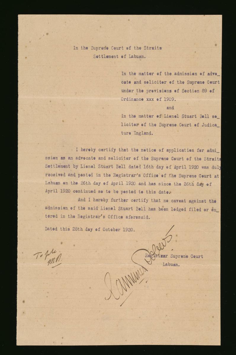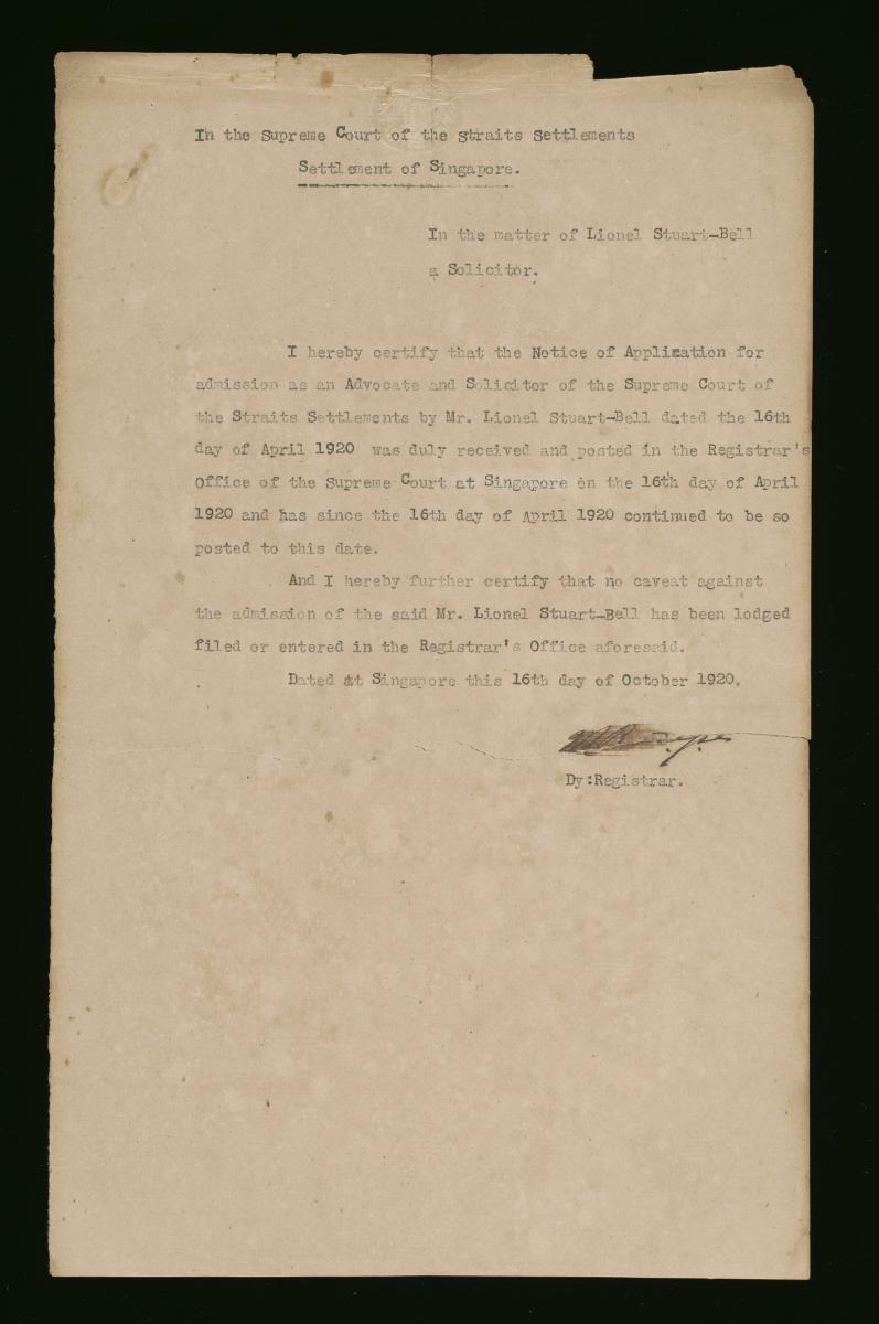 This is a notice filed by Lionel Stuart-Bell on 16 April 1920. It is part of a collection of legal documents from the 19th and early 20th centuries which provides a glimpse into the work of the notable personalities who left their mark on Singapore’s legal history, and the economic and other transactions undertaken by ordinary immigrants in 19th century Singapore that tell stories of misfortune and indebtedness which would otherwise have disappeared from history.