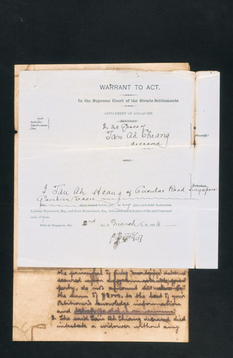These are the warrant to act and the petition issued by Tan Swee Hong concerning the administration of the estate of Gan E. Neo. They are part of a collection of legal documents from the 19th and early 20th centuries which provides a glimpse into the work of the notable personalities who left their mark on Singapore’s legal history, and the economic and other transactions undertaken by ordinary immigrants in 19th century Singapore that tell stories of misfortune and indebtedness which would otherwise have disappeared from history.