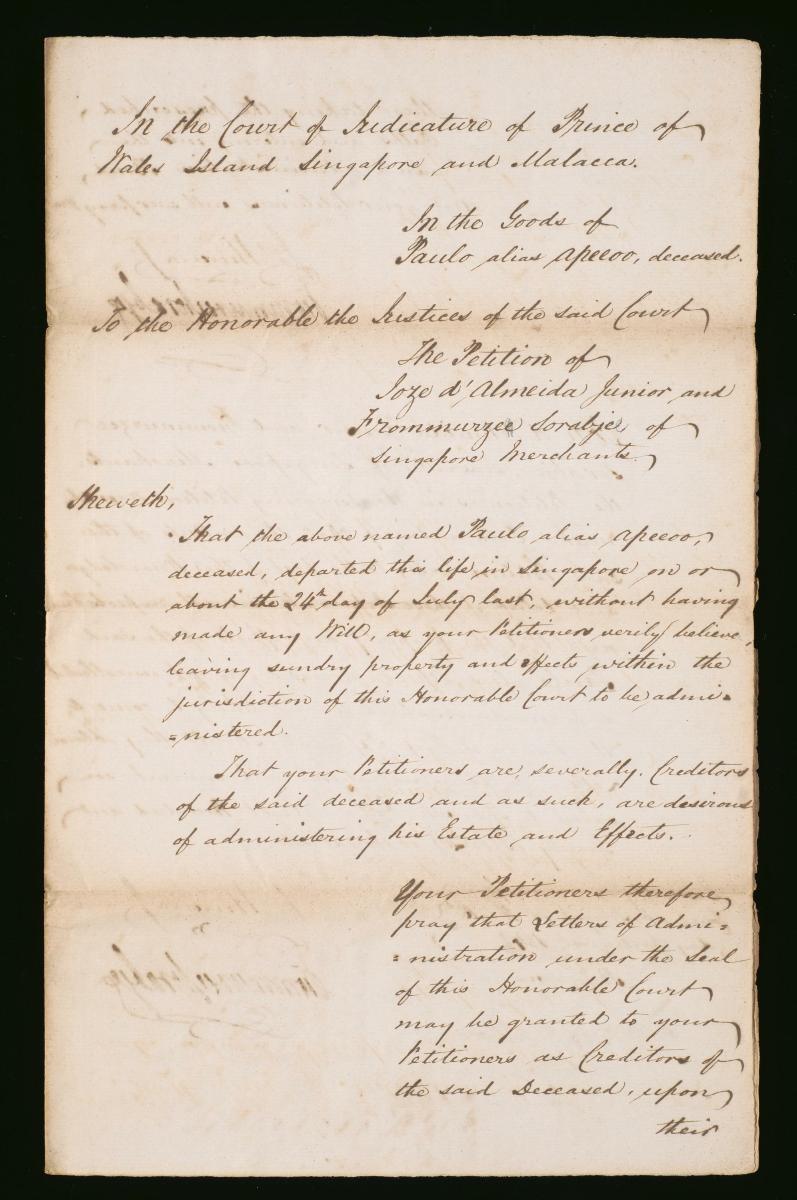 This is the petition of Francisco Evaristo Pereira concerning the administration of the estate of the deceased Anna D' Almeida Grandpre. It is part of a collection of legal documents from the 19th and early 20th centuries which provides a glimpse into the work of the notable personalities who left their mark on Singapore’s legal history, and the economic and other transactions undertaken by ordinary immigrants in 19th century Singapore that tell stories of misfortune and indebtedness which would otherwise have disappeared from history.