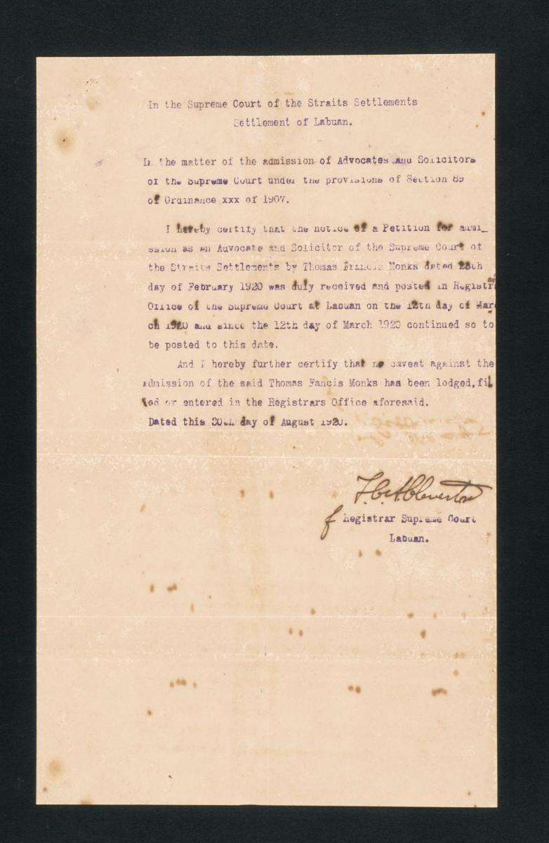 This is a letter from the Registrar of the Supreme Court of the Straits Settlements in Labuan to Thomas Francis Monks dated 30 August 1920. It is part of a collection of legal documents from the 19th and early 20th centuries which provides a glimpse into the work of the notable personalities who left their mark on Singapore’s legal history, and the economic and other transactions undertaken by ordinary immigrants in 19th century Singapore that tell stories of misfortune and indebtedness which would otherwise have disappeared from history.