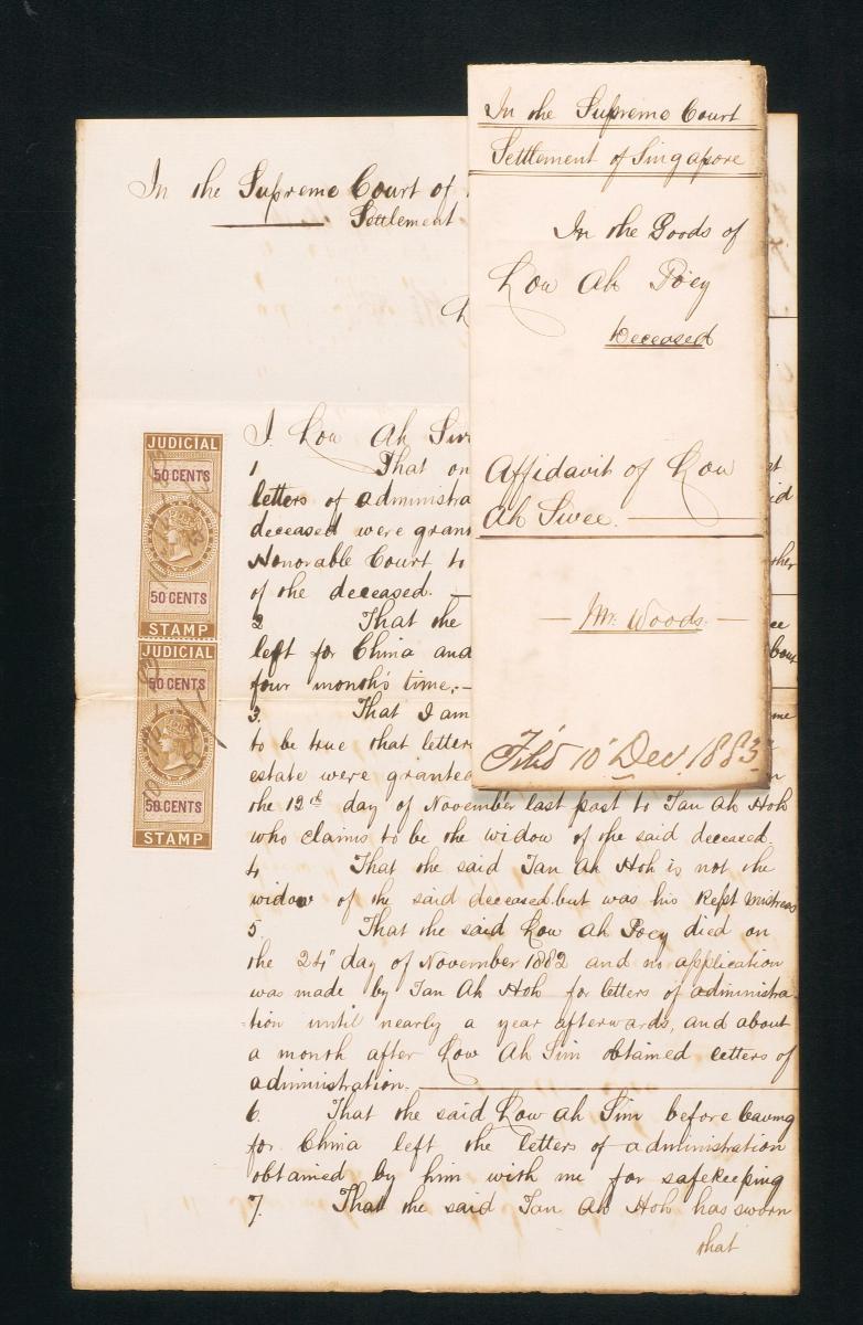 This is a motion paper filed by Charles Keish Elphinstore Woods (C.K.E. Woods), the advocate for Low Ah Sin, on 17 December 1883 concerning the administration of the estate of the deceased Low Ah Poey. It is part of a collection of legal documents from the 19th and early 20th centuries which provides a glimpse into the work of the notable personalities who left their mark on Singapore’s legal history, and the economic and other transactions undertaken by ordinary immigrants in 19th century Singapore that tell stories of misfortune and indebtedness which would otherwise have disappeared from history.