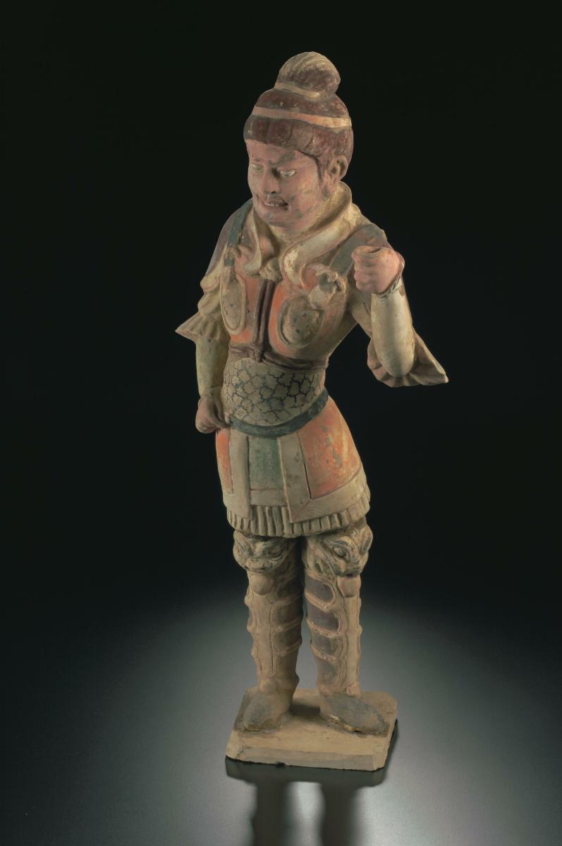 This thickly moulded standing warrior was part of a group of tomb figures. He has big bulbous eys and wears an elaborate warrior's outfit, which includes a motif of a grimacing beast on the chest. His hands are clenched as if holding a weapon. The custom of making 'mingqi' or burial wares was an ancient practice. It was believed that these were necessary for the deceased in the next world. Elaborate groups of burial wares were also a display of wealth and social status.