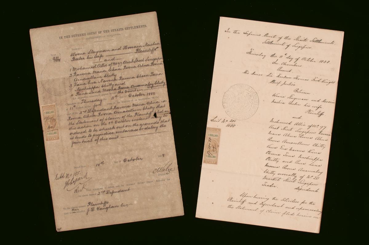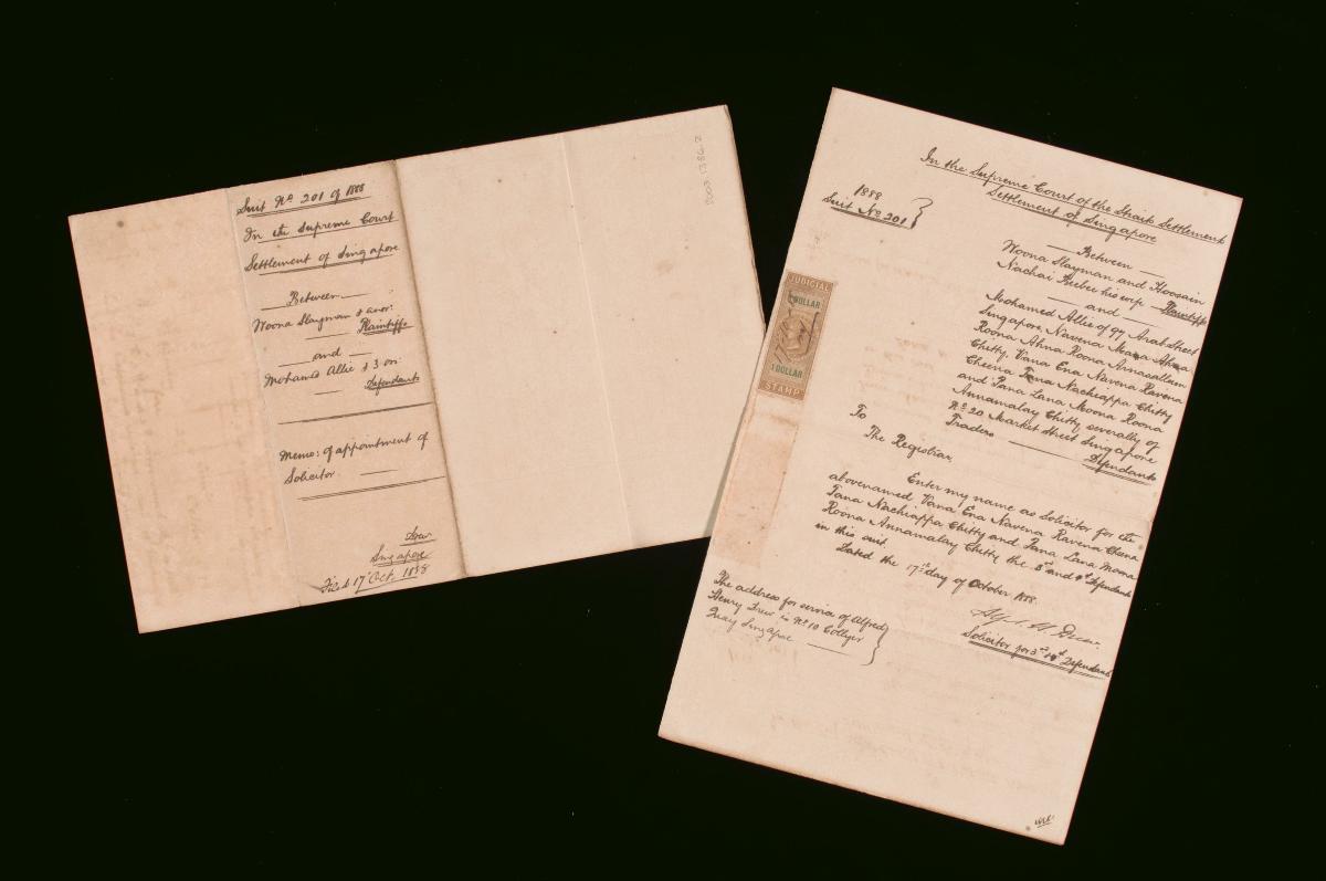 This is a notice of the withdrawal of the solicitor for the plaintiffs issued on 20 October 1888 concerning the case between Woona Slayman Janor and others (plaintiffs) and Mohamed Allie and others (defendants). The solicitor J.D. Vaughn withdrew and desired for an entry of such a discharge to be made in the appearance book. This notice is part of a collection of legal documents from the 19th and early 20th centuries which provides a glimpse into the work of the notable personalities who left their mark on Singapore’s legal history, and the economic and other transactions undertaken by ordinary immigrants in 19th century Singapore that tell stories of misfortune and indebtedness which would otherwise have disappeared from history.