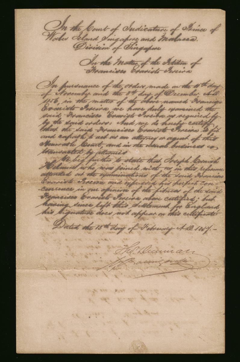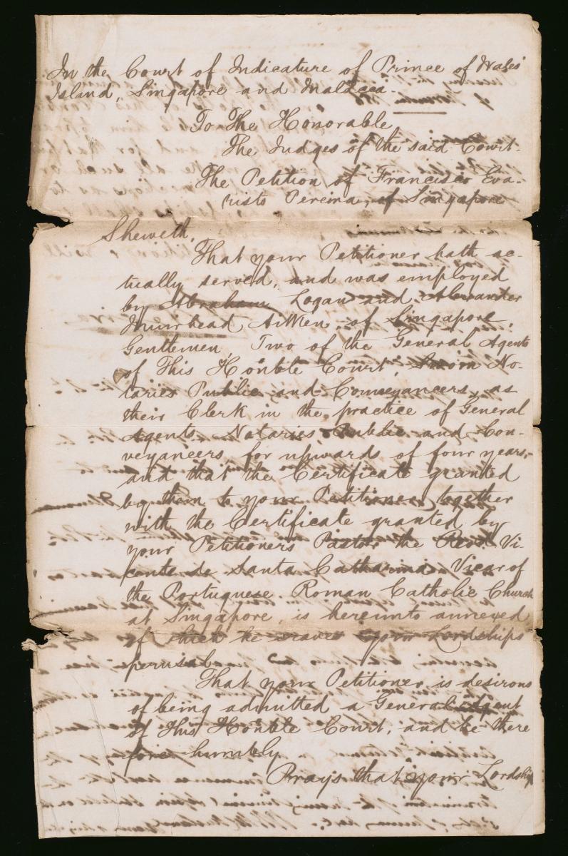 This is the cover page of a petition for leave for Francisco Evaristo Pereira, filed on 23 November 1865. It is part of a collection of legal documents from the 19th and early 20th centuries which provides a glimpse into the work of the notable personalities who left their mark on Singapore’s legal history, and the economic and other transactions undertaken by ordinary immigrants in 19th century Singapore that tell stories of misfortune and indebtedness which would otherwise have disappeared from history.