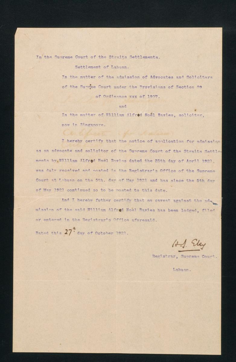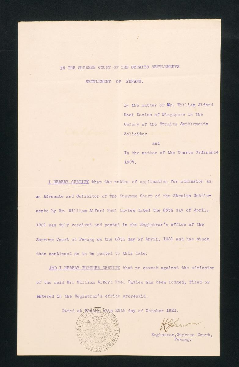 This is a registrar's certificate issued on 27 October 1921 by the Registrar of the Supreme Court of the Straits Settlements in Singapore for William Alford Noël Davies. It is part of a collection of legal documents from the 19th and early 20th centuries which provides a glimpse into the work of the notable personalities who left their mark on Singapore’s legal history, and the economic and other transactions undertaken by ordinary immigrants in 19th century Singapore that tell stories of misfortune and indebtedness which would otherwise have disappeared from history.