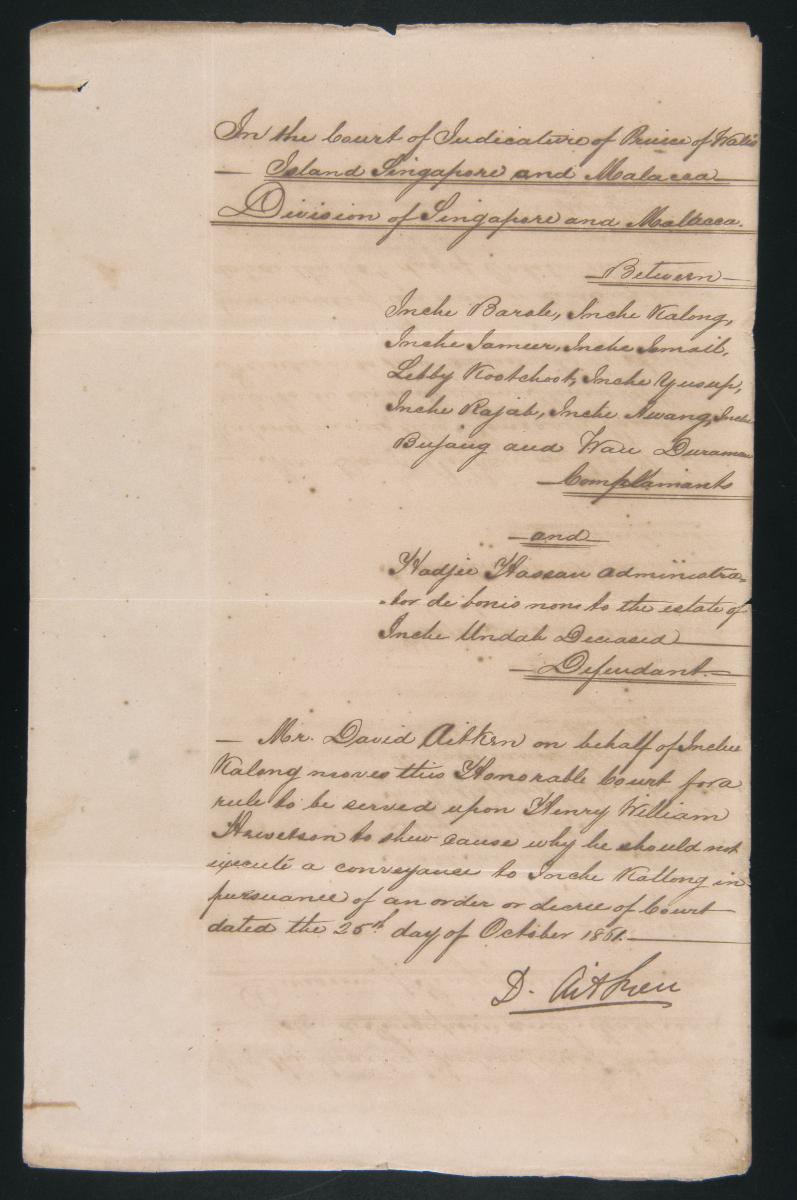 This is a statement of reply issued on 14 June 1883 concerning the suit between Abdul Ranee and his wife, Inche Somah binte Hadjee Abdul Karrim (plaintiffs), and Christopher Trebing (defendant). It is part of a collection of legal documents from the 19th and early 20th centuries which provides a glimpse into the work of the notable personalities who left their mark on Singapore’s legal history, and the economic and other transactions undertaken by ordinary immigrants in 19th century Singapore that tell stories of misfortune and indebtedness which would otherwise have disappeared from history.