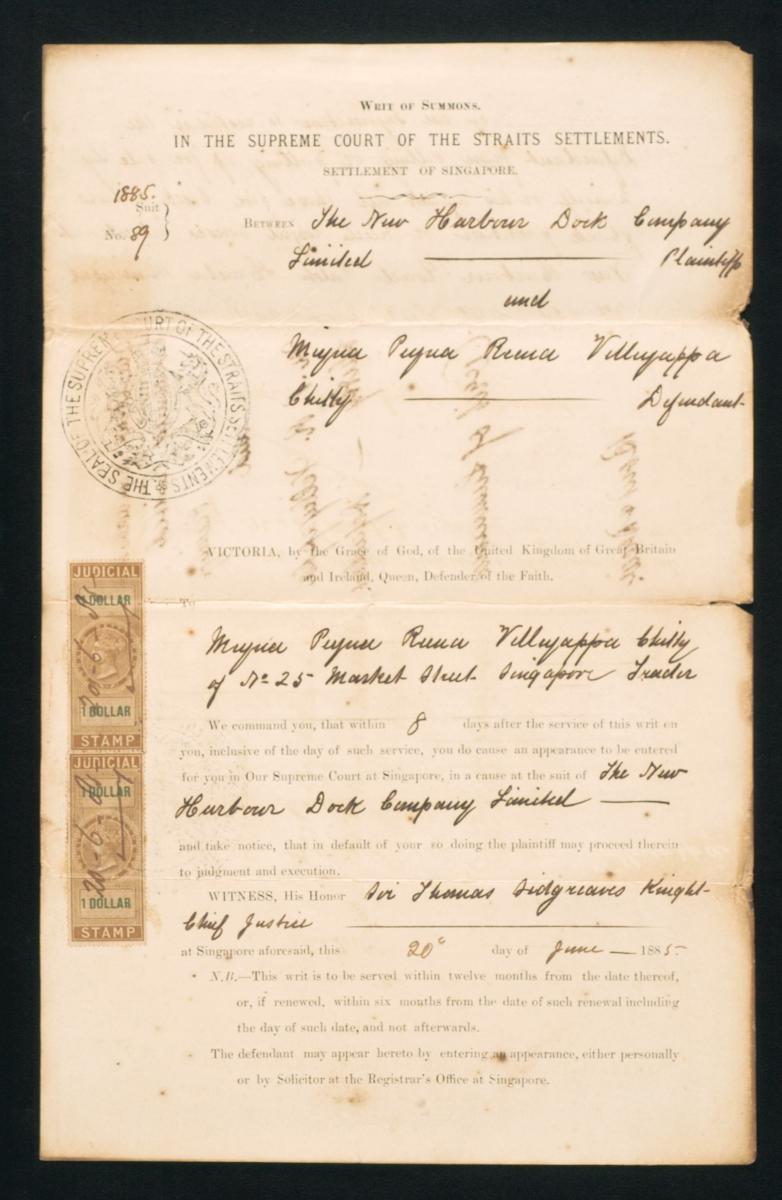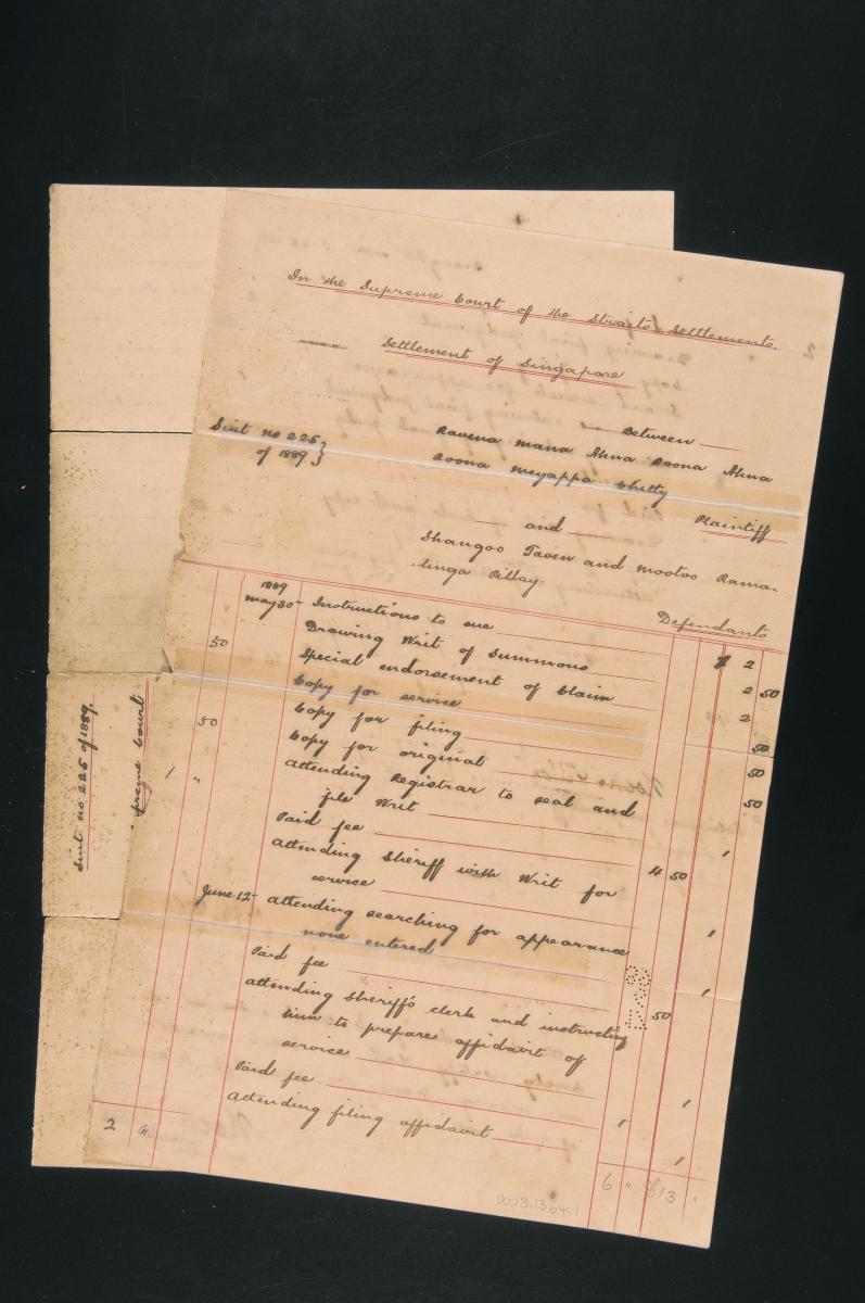 This is the bill of costs for Mayna Cheena Allagappa Chitty on 28 September 1888, the plaintiff in the suit against the defendants H.E. Gois and W.R. Mootoo Samy Pillay. It is part of a collection of legal documents from the 19th and early 20th centuries which provides a glimpse into the work of the notable personalities who left their mark on Singapore’s legal history, and the economic and other transactions undertaken by ordinary immigrants in 19th century Singapore that tell stories of misfortune and indebtedness which would otherwise have disappeared from history.