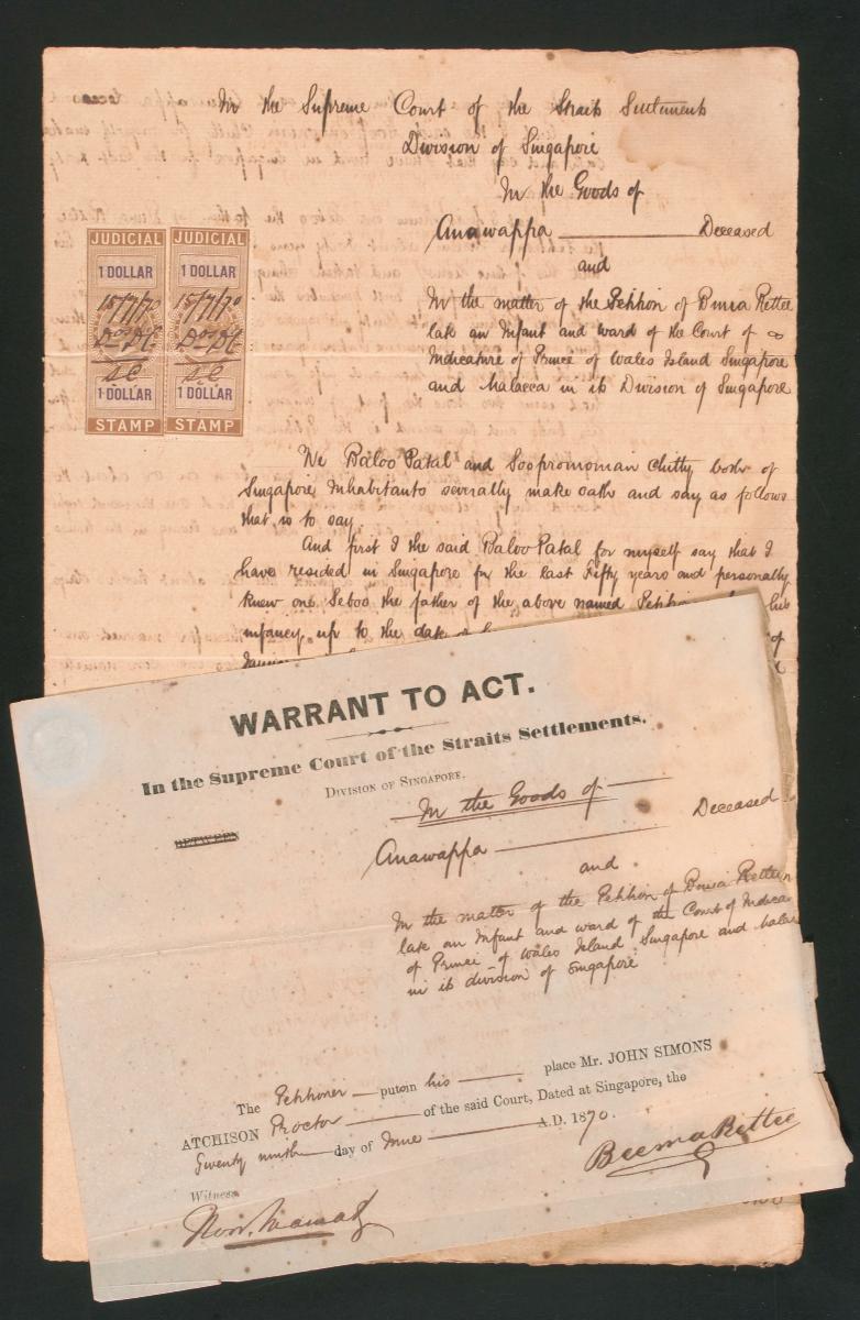 These are the warrant to act and will concerning the estate of John Worherspoon. The warrant to act was issued by Alexander McAlister on 5 September 1872, while Worherspoon's last will and testament was published in June 1871 in Bangkok. They are part of a collection of legal documents from the 19th and early 20th centuries which provides a glimpse into the work of the notable personalities who left their mark on Singapore’s legal history, and the economic and other transactions undertaken by ordinary immigrants in 19th century Singapore that tell stories of misfortune and indebtedness which would otherwise have disappeared from history.