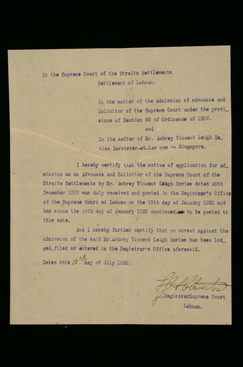 This is a registrar's certificate issued on 27 October 1921 by the Registrar of the Supreme Court of the Straits Settlements in Labuan for William Alford Noël Davies. It is part of a collection of legal documents from the 19th and early 20th centuries which provides a glimpse into the work of the notable personalities who left their mark on Singapore’s legal history, and the economic and other transactions undertaken by ordinary immigrants in 19th century Singapore that tell stories of misfortune and indebtedness which would otherwise have disappeared from history.