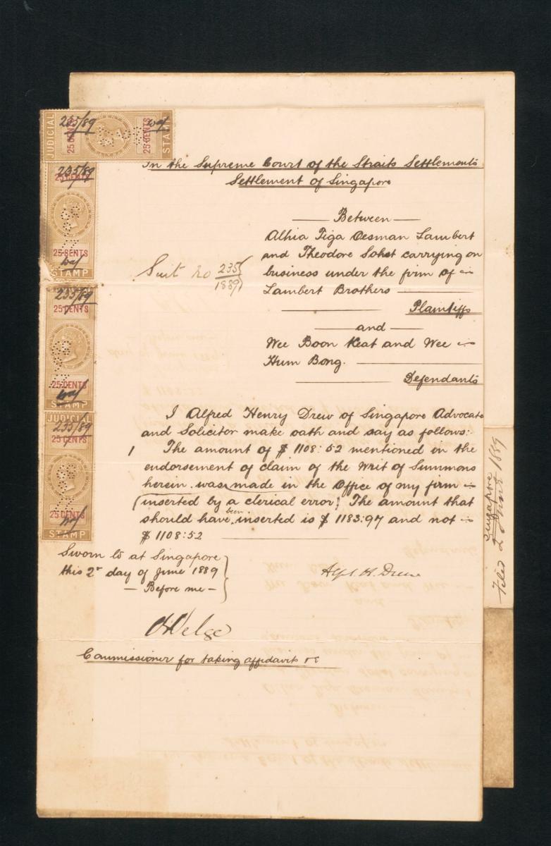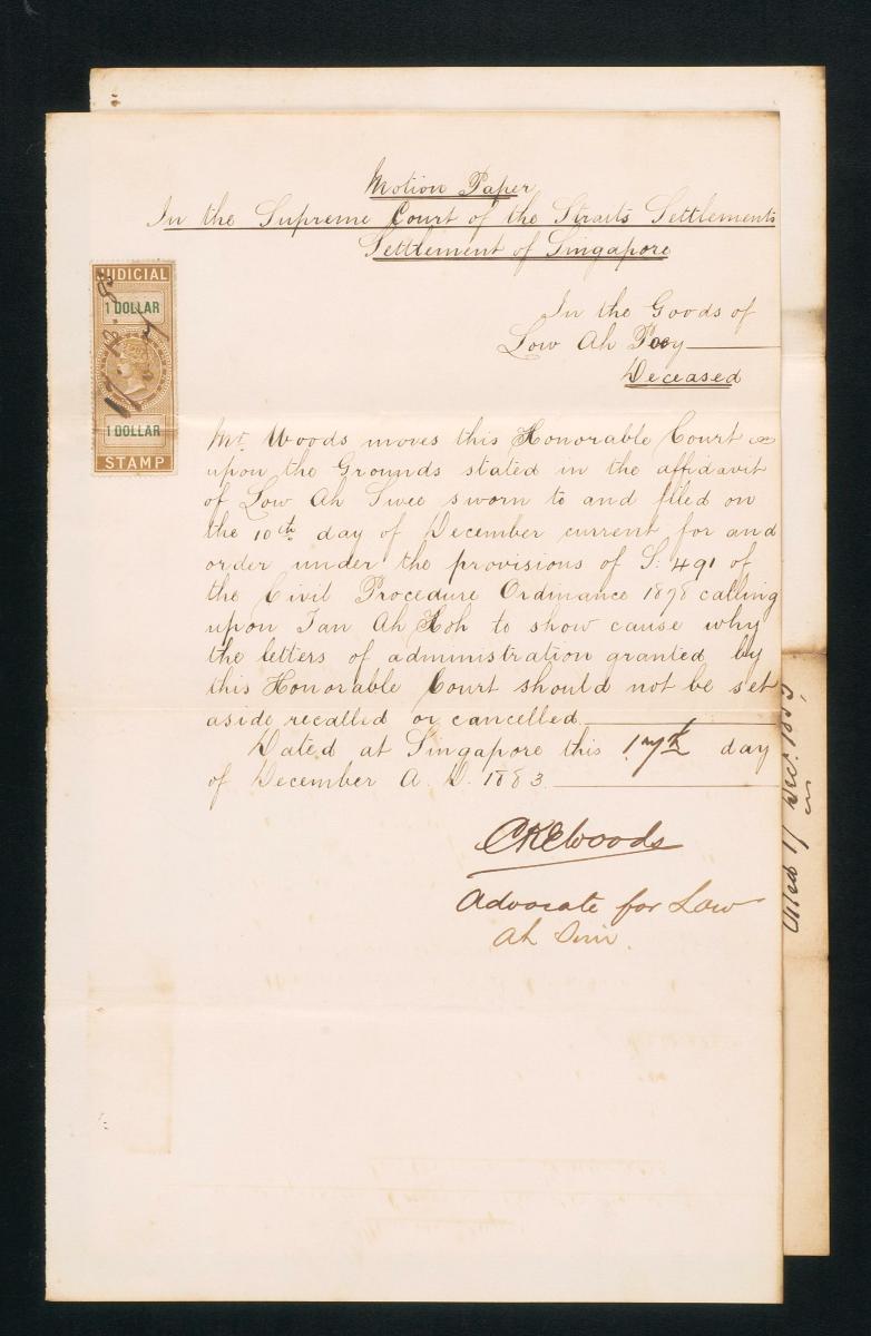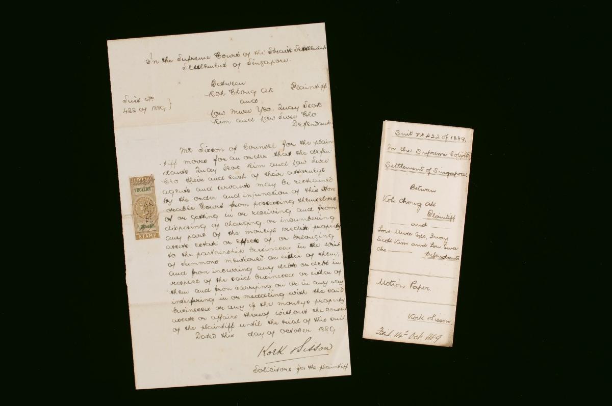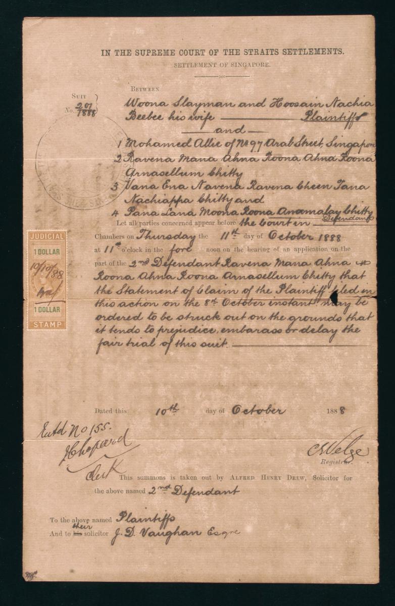 This is a motion paper filed in June 1885 by Alfred Henry Drew, the solicitor for the plaintiff, The New Harbour Dock Company Limited, in the suit against the defendant Mayna Payna Reena Vellyappa Chitty. Drew filed for an injunction to restrain the defendant from selling or putting up for sale by himself or his agents the five brick pillars, planks, partitions, and filed roofed houses situated at New Harbour Road Pulau Hantu Municipal No. 239, 240, 241, 242, and 243. This document is part of a collection of legal documents from the 19th and early 20th centuries which provides a glimpse into the work of the notable personalities who left their mark on Singapore’s legal history, and the economic and other transactions undertaken by ordinary immigrants in 19th century Singapore that tell stories of misfortune and indebtedness which would otherwise have disappeared from history.