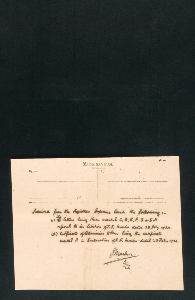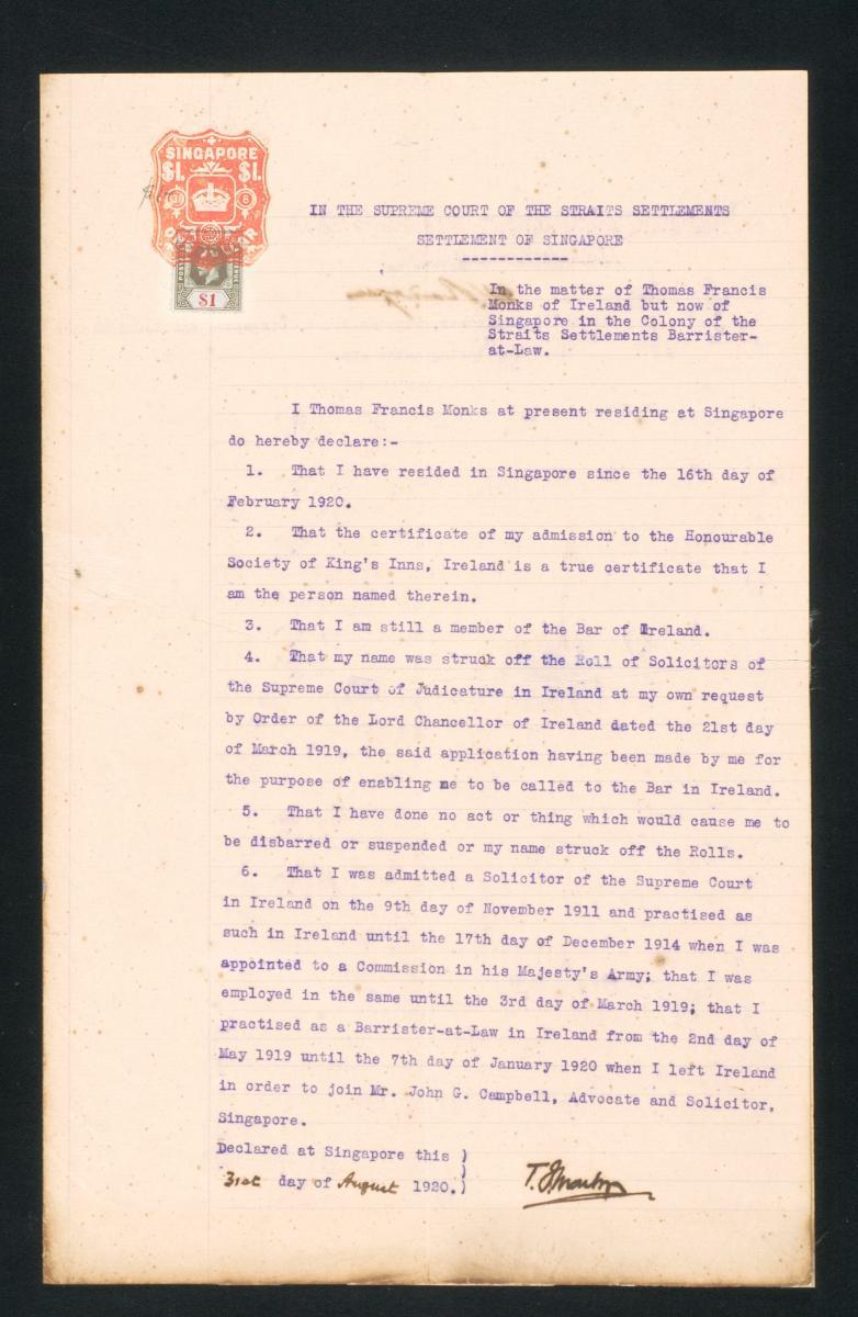 This is the declaration of Thomas Francis Monks made on 23 February 1920. It is part of a collection of legal documents from the 19th and early 20th centuries which provides a glimpse into the work of the notable personalities who left their mark on Singapore’s legal history, and the economic and other transactions undertaken by ordinary immigrants in 19th century Singapore that tell stories of misfortune and indebtedness which would otherwise have disappeared from history.