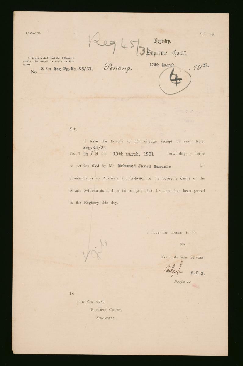 This is a letter from the Registrar of the Supreme Court of the Straits Settlements in Penang to the Registrar of the Supreme Court in Singapore dated 1 April 1935, concerning the receipt of a previous letter about the appointment of Charles Valentine Miles and John Christopher Cobbett as Commissioners for Oaths for Singapore. This document is part of a collection of legal documents from the 19th and early 20th centuries which provides a glimpse into the work of the notable personalities who left their mark on Singapore’s legal history, and the economic and other transactions undertaken by ordinary immigrants in 19th century Singapore that tell stories of misfortune and indebtedness which would otherwise have disappeared from history.