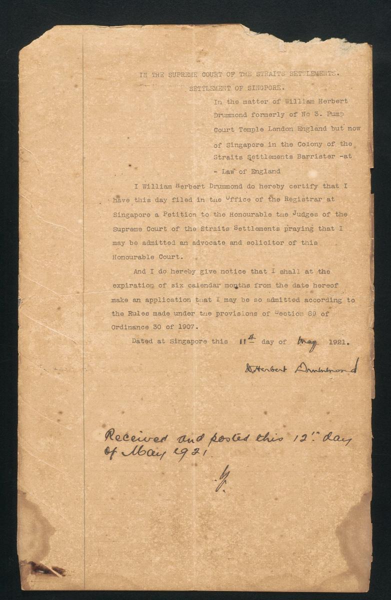 This is the petition of William Herbert Drummond made on 11 May 1921 concerning his application for admission as a solicitor and advocate to the Supreme Court of the Straits Settlements. It is part of a collection of legal documents from the 19th and early 20th centuries which provides a glimpse into the work of the notable personalities who left their mark on Singapore’s legal history, and the economic and other transactions undertaken by ordinary immigrants in 19th century Singapore that tell stories of misfortune and indebtedness which would otherwise have disappeared from history.