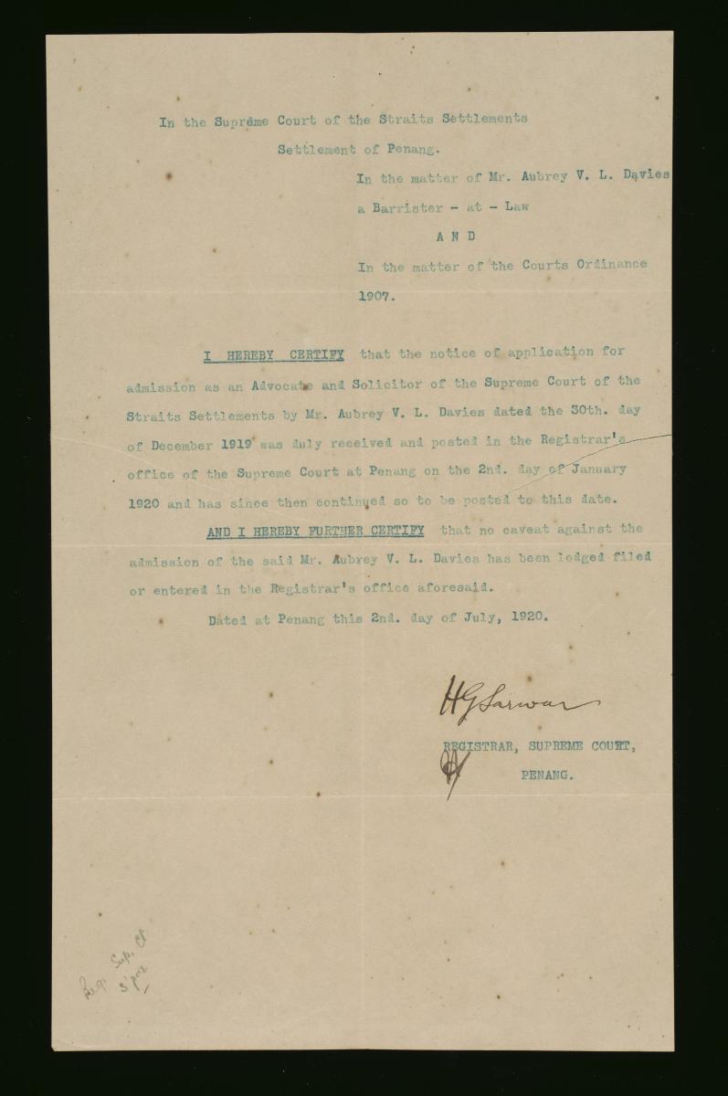 This is a registrar's certificate issued on 28 October 1921 by the Registrar of the Supreme Court of the Straits Settlements in Penang for William Alford Noël Davies. It is part of a collection of legal documents from the 19th and early 20th centuries which provides a glimpse into the work of the notable personalities who left their mark on Singapore’s legal history, and the economic and other transactions undertaken by ordinary immigrants in 19th century Singapore that tell stories of misfortune and indebtedness which would otherwise have disappeared from history.