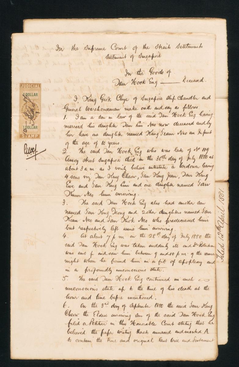 This is the affidavit of Tan Swee Lye sworn on 24 July 1889 concerning the suit between Babaji bin Sorabjee (plaintiff) and Mohamed Eusop Anguilla (defendant). It is part of a collection of legal documents from the 19th and early 20th centuries which provides a glimpse into the work of the notable personalities who left their mark on Singapore’s legal history, and the economic and other transactions undertaken by ordinary immigrants in 19th century Singapore that tell stories of misfortune and indebtedness which would otherwise have disappeared from history.