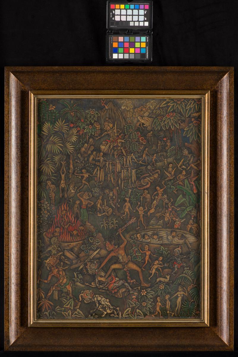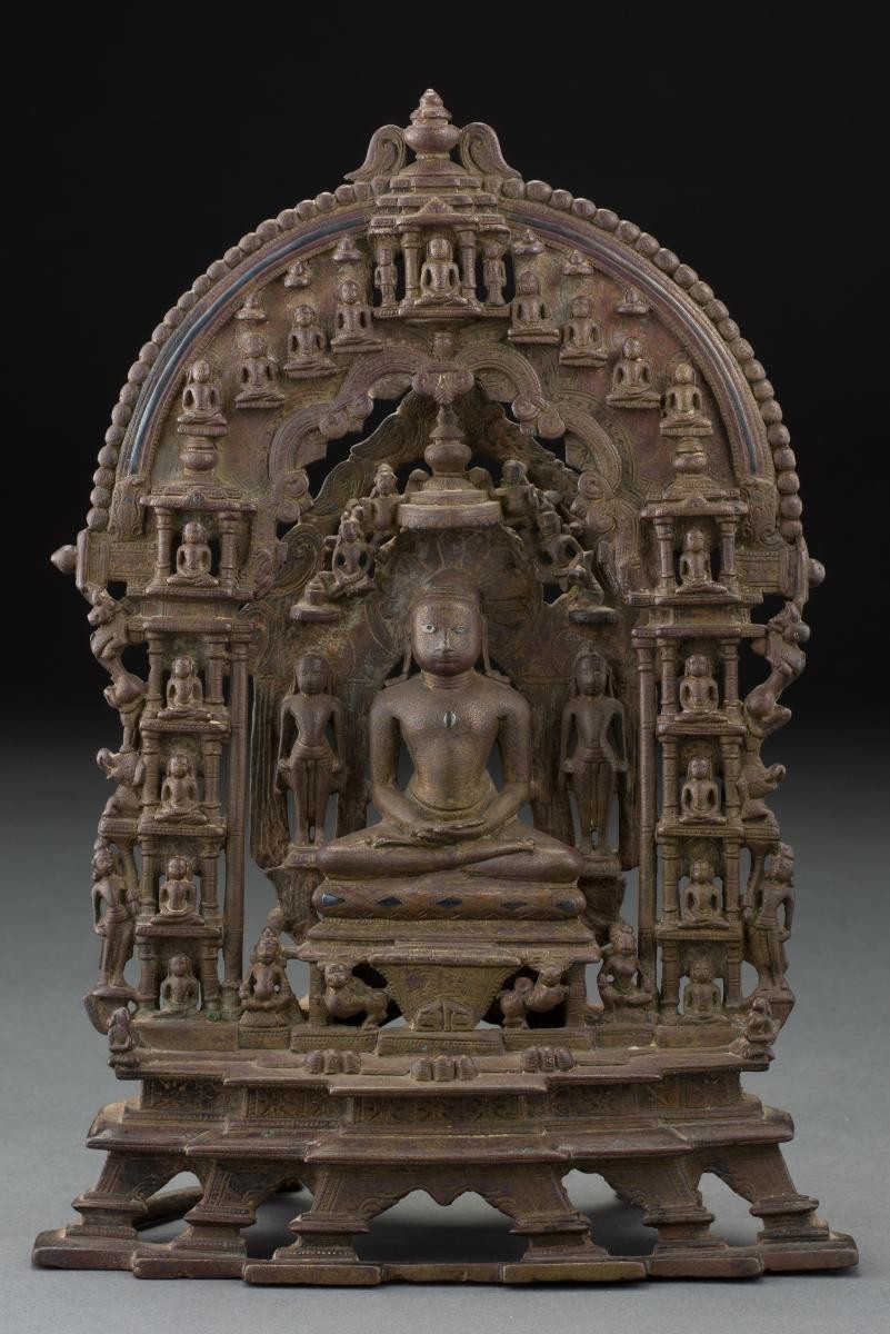 This iconic painting of the first Jain Tirthankara (enlightened being) with his Yaksha-Yakshi (nature spirits) parents is seen seated under a canopy, typical of the Mysore painting of Hindu subject matter. In the foreground, the eight auspicious symbols (conch, knot, fish, lotus, parasol, urn, wheel and victory banner), which are common to Buddhist and Hindu art, are placed.