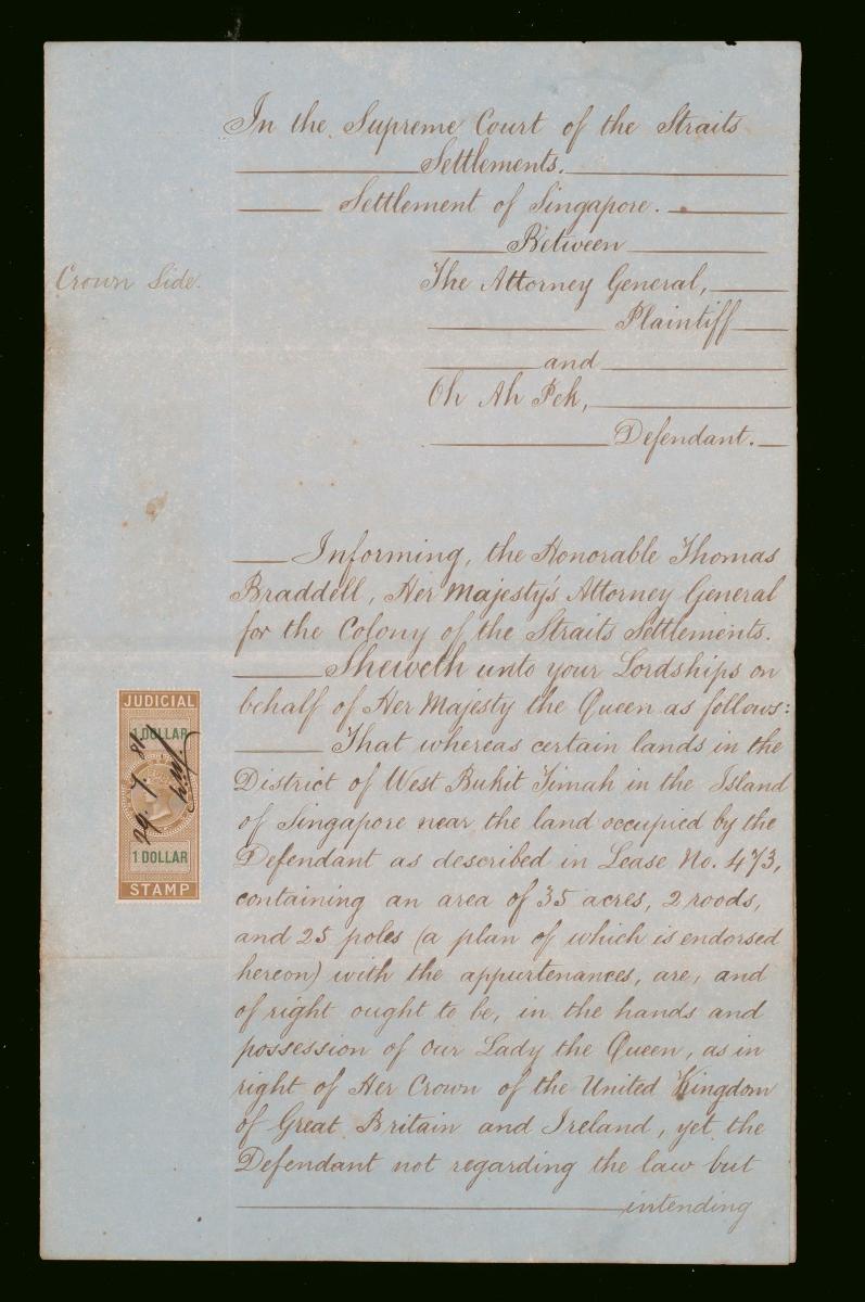 This is a statement of reply concerning the suit between the Attorney General at the time of writing, Thomas Braddell, and Oh Ah Pek. It is part of a collection of legal documents from the 19th and early 20th centuries which provides a glimpse into the work of the notable personalities who left their mark on Singapore’s legal history, and the economic and other transactions undertaken by ordinary immigrants in 19th century Singapore that tell stories of misfortune and indebtedness which would otherwise have disappeared from history.